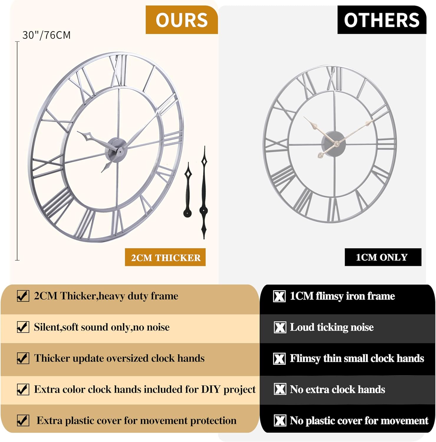 - [Easy to Read and Hang]-30" (75cm) Oversized large Roman numerals in contrast with aluminum large hands for easily reading. Simple design with a good performance. Package Comes with 1 set extra black color interchangeable Clock Hands,also included Invisible Nail Hangers for hanging
