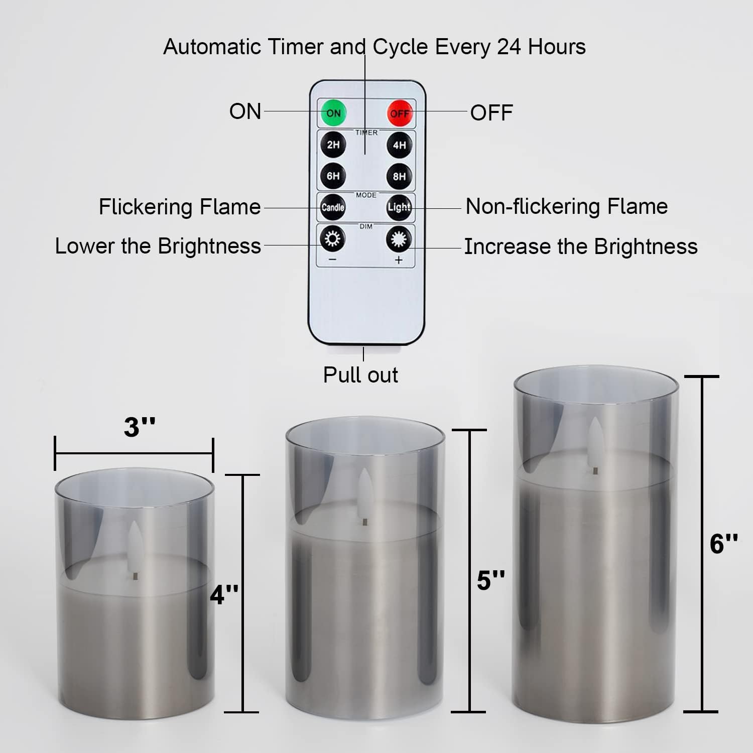 - Package Includes: This glass candle set includes three flameless pillar candles(D3”x H4”5”6”), a 10-key remote control, and one user manual. Each battery candle is powered by 2 x AA batteries (not included) which can live up to 500+ hours.