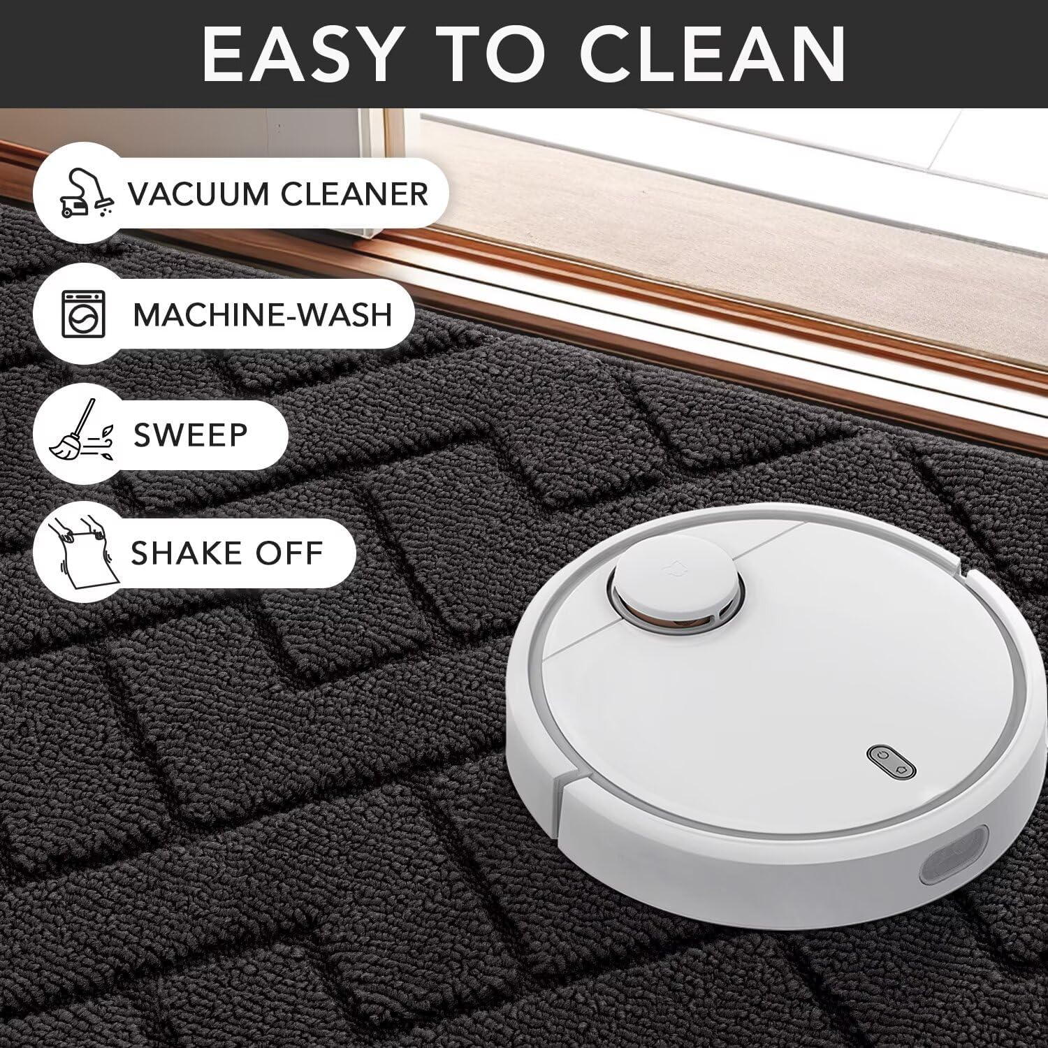 - EASY TO CLEAN: The unique rib fabric design removes dirt from shoes easily. When your doormat gets dirty, first shake it off outdoors or over your garbage bins, then sweep with a broom or vacuum regularly or use a garden hose to rinse the mat outdoors. For deeper clean: machine washable, use water under 86 (℉) / 30 (℃). Do not iron. Do not bleach. Do not expose it to the sun for a long time.