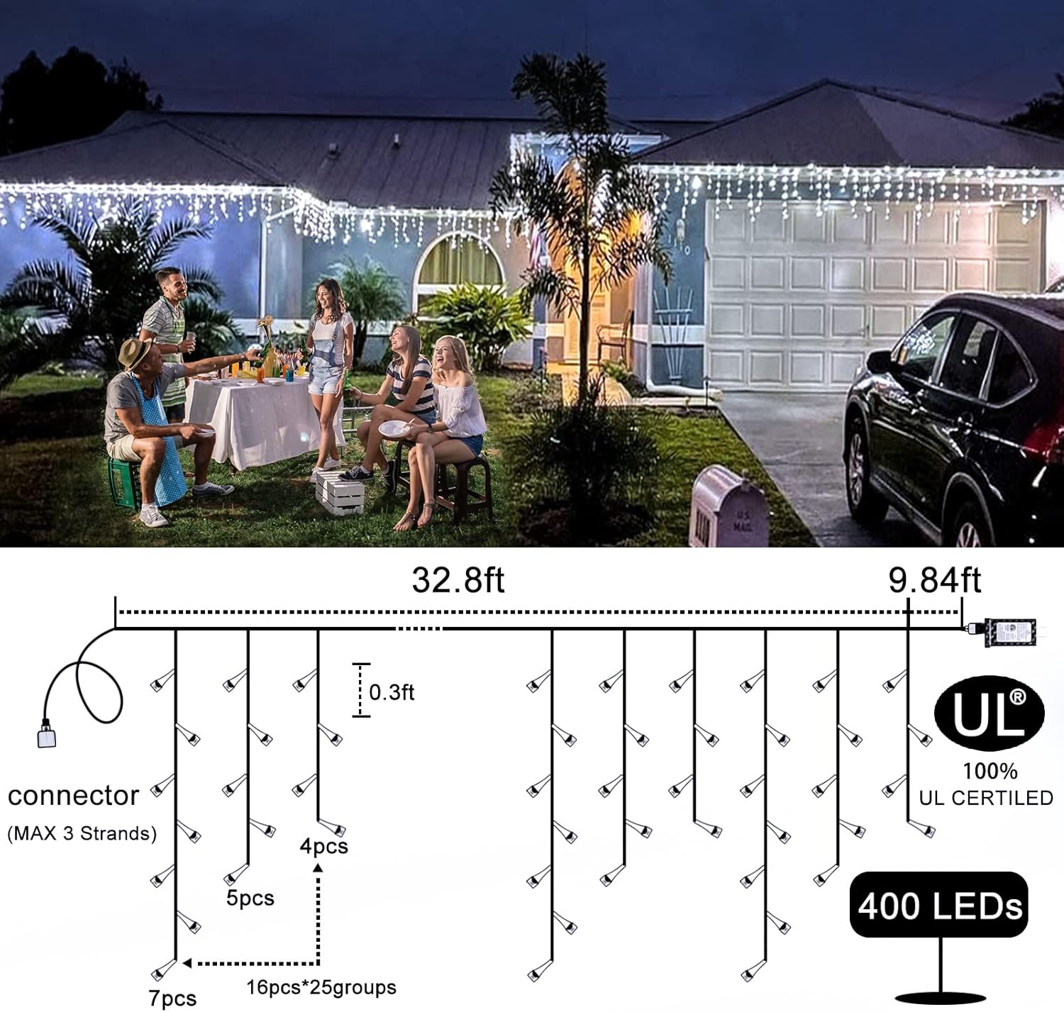- 【LED Icicle Christmas Lights】-400LED Christmas icicle lights totally length is 43ft, including 33ft icicle lights and 10ft extension cord. The outdoor Christmas lights can be connected up to 3 sets to decorate larger areas, suitable for use throughout the year - birthdays, anniversaries, Christmas decoration. The connectable icicle lights can be controlled by one button on the power adapter. Hang these fairy string lights outdoor indoor to create warm and romantic atmosphere for you.