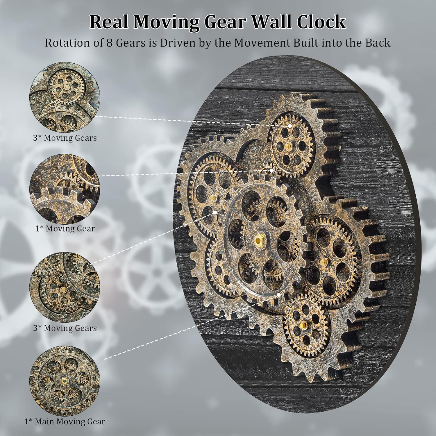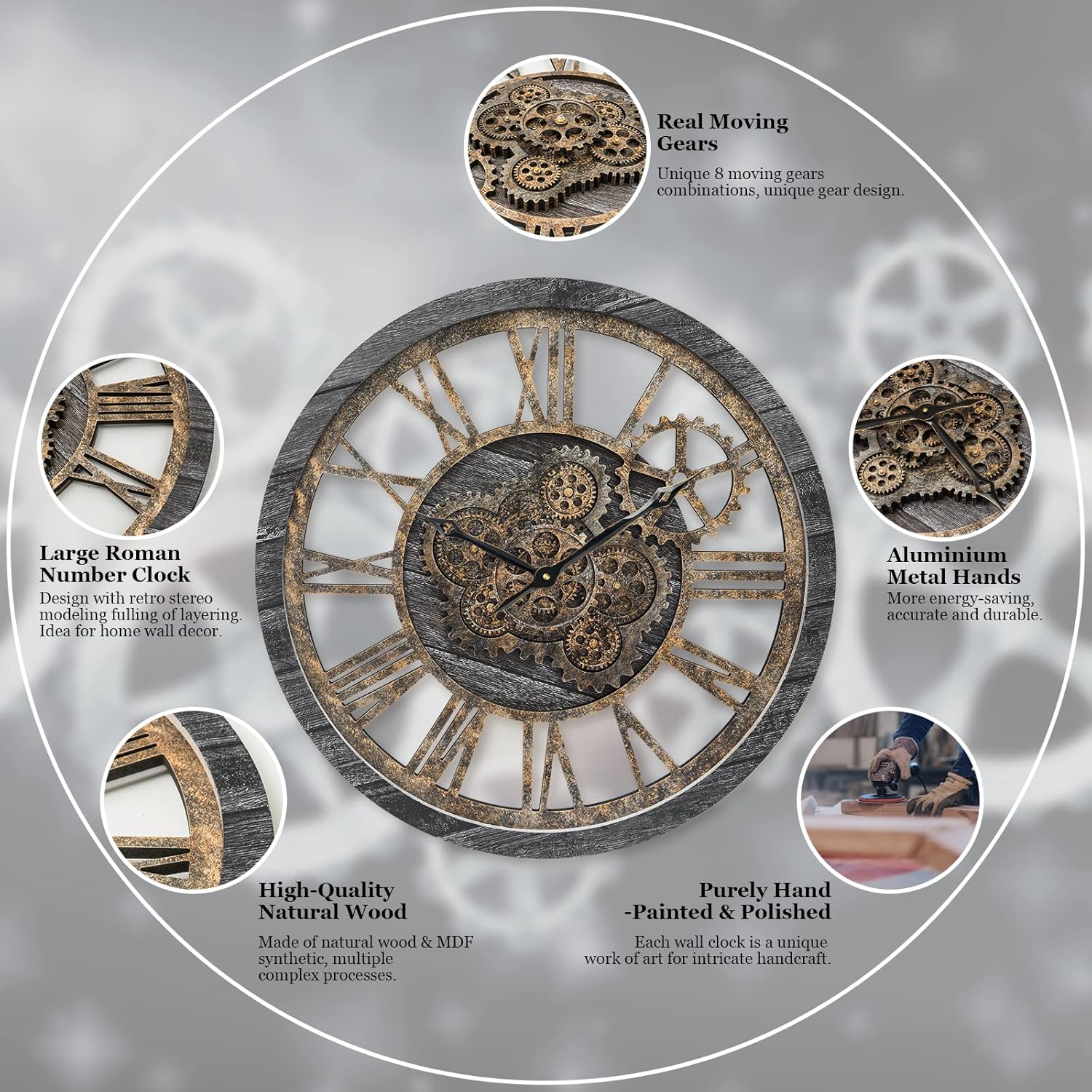 - 【Real Moving Gear Clock】All gears for the wall clock are real moving! Design with rustic bronze-color and industrial style. An creative combination of four gears for a retro look, has a very exquisite decorative effect makes the wall clock become a chic art works. The large wall clock crafted of nature wood & MDF. Big roman numeral numbers and wood rustic moving gears perfect for any room decor.