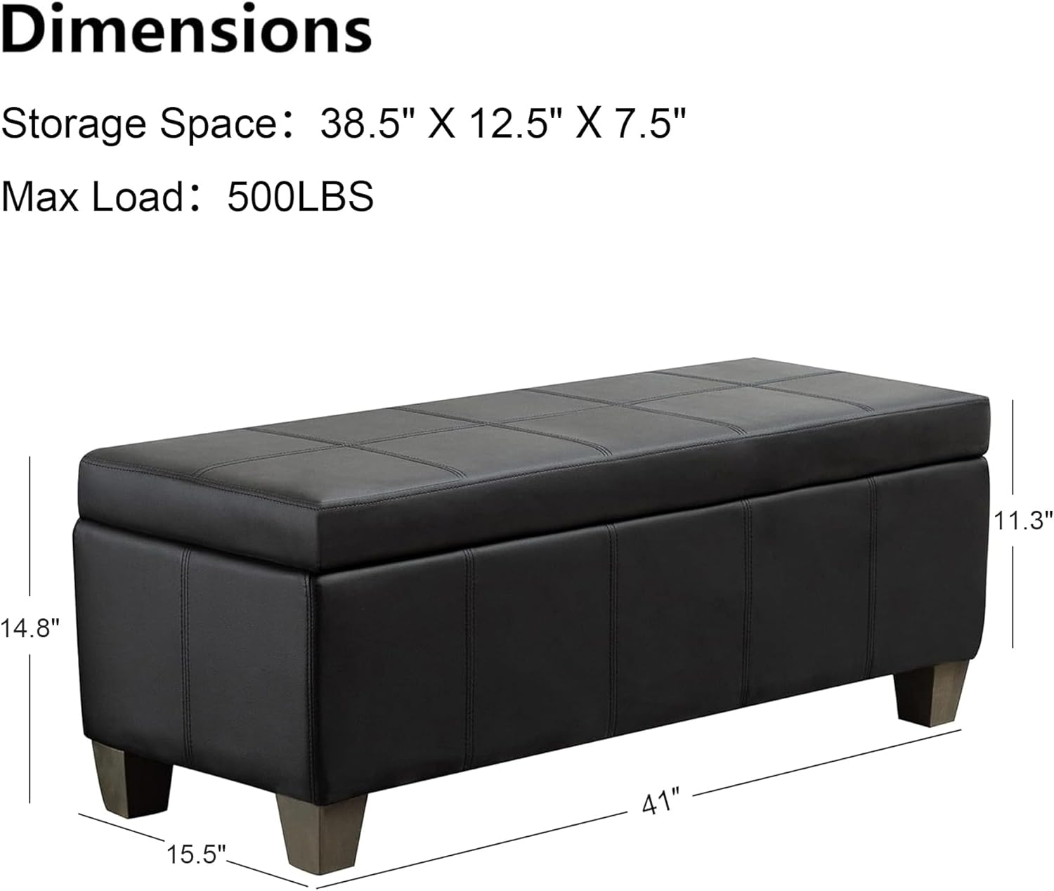 - OVERALL DEMENSION: The overall size of UDAX faux leather ottoman is 41‘*15.5’*14.8‘ and the inside storage dimension is 38.5’*12.5‘*7.5’. Our storage bench is wide enough to sit cozily and large enough to store your blanket, clothes, children's toys, and so on. It has plenty of space to help you organize every corner of your home.