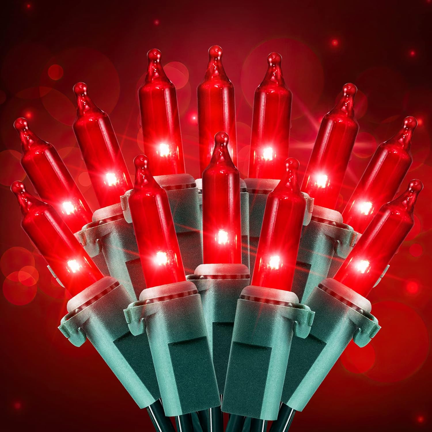 - ๐2Pack Incandescent Christmas Lights:Hopolon 2 PACK 50L Red Christmas mini lights is 13ft in total-Green wire with Bulbs: 3.5m/11.5ft, cord without lights50cm/1.5ft, spacing between every bulb: 7cm/2.76in. With Thicker green wire with strong insulated copper core, tangle-free to use,High quality UL certified products ensure the safety of you and your family.