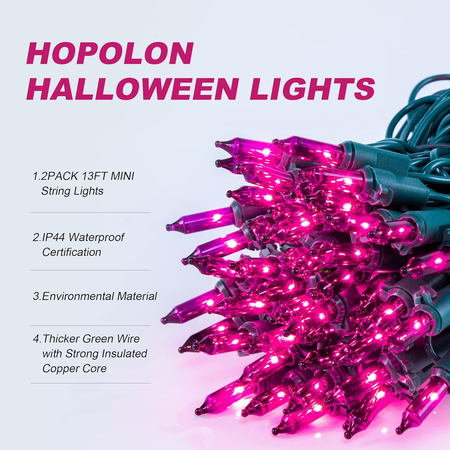 - ๐ป2Pack Incandescent Halloween Lights:Hopolon 2 PACK 50L Purple Halloween mini lights is 13ft in total-Green wire with Bulbs: 3.5m/11.5ft, cord without lights50cm/1.5ft, spacing between every bulb: 7cm/2.76in. With Thicker green wire with strong insulated copper core, tangle-free to use,High quality UL certified products create a horrifying festive atmosphere, surely lights up your room and house. A spooky decorative lights at night to make your home a horror sight in the neighborhood!