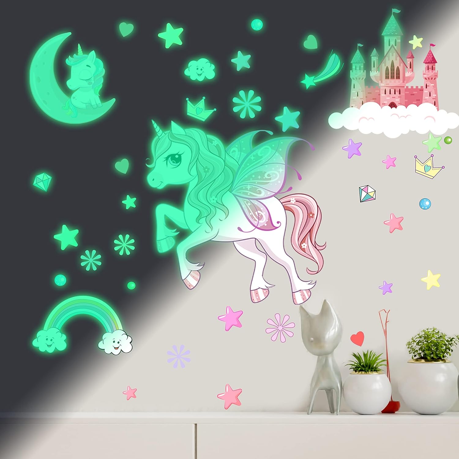 - 【Glow In The Dark Unicorn Decal】- This unicorn wall sticker include unicorn, castle, moon, rainbow and so on, which can be freely combined. It’s a lovely graphic decoration during the day and glows in the dark at night.