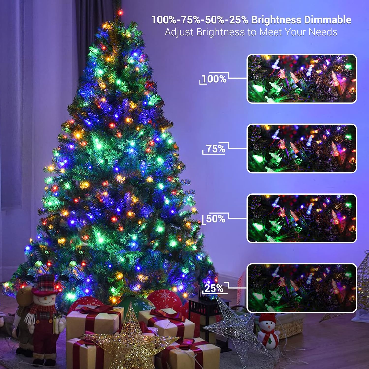 - Dimmable LED Xmas String Lights with memory function: 100%-75%-50%-25% 4 level brightness, create suitable, comfortable atmospheres at your needs according to various occasions. Noted: While in multicolor modes, all the colors (including red, yellow, blue, green) will be shown together, no specific colors can be set up! Built-in memory function, remember your last mode, no need to reset every time