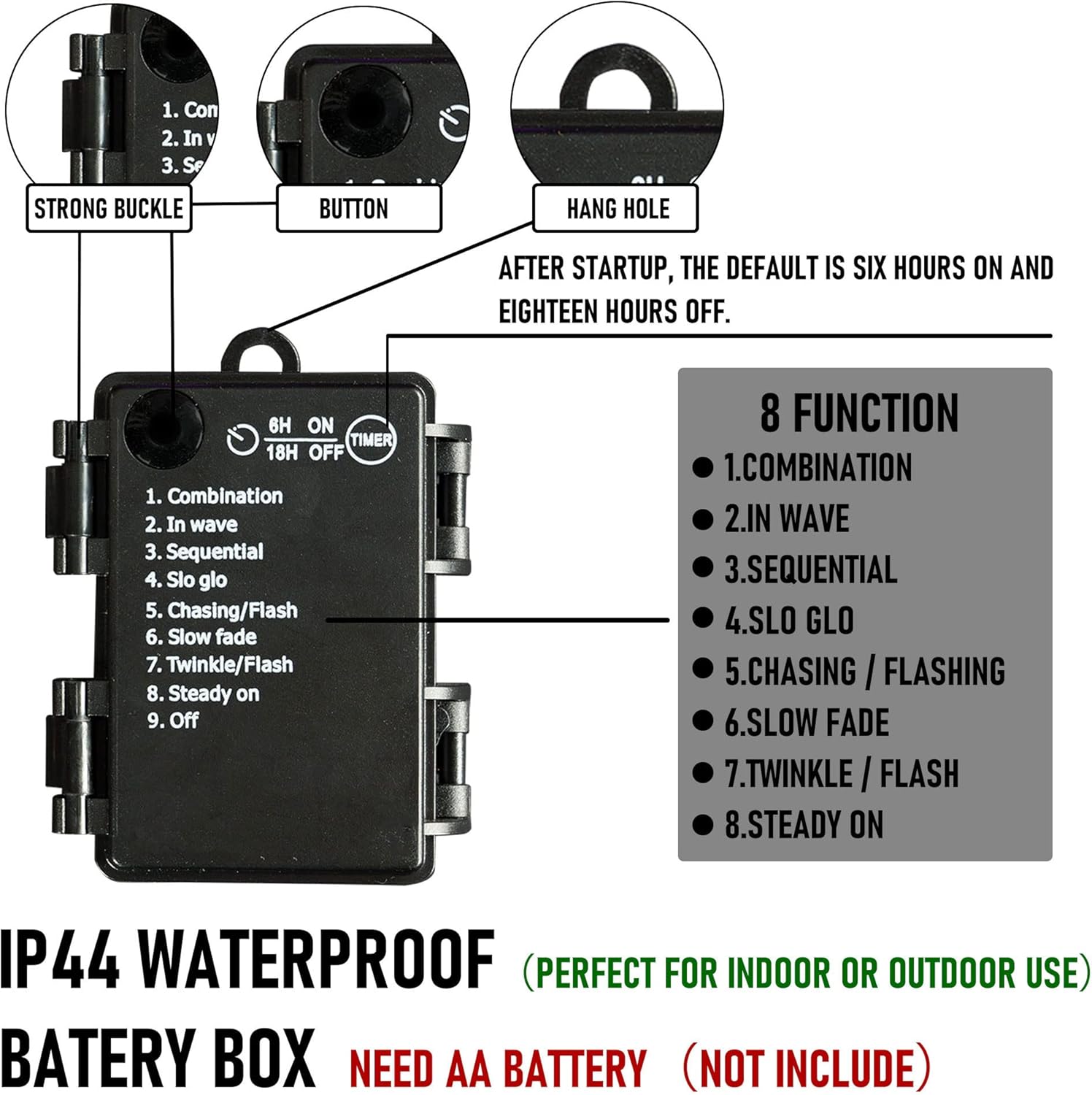 - Waterproof & Safety: Both the Battery box and fairy string lights are IP 44 waterproof. Perfect for outdoor festival Xmas decorations required. It won't over heat after long time working and is safety for touching, no danger to kids and pets. The sturdy bulb fits seamlessly with the socket to ensure a firm installation and will not fall during use.
