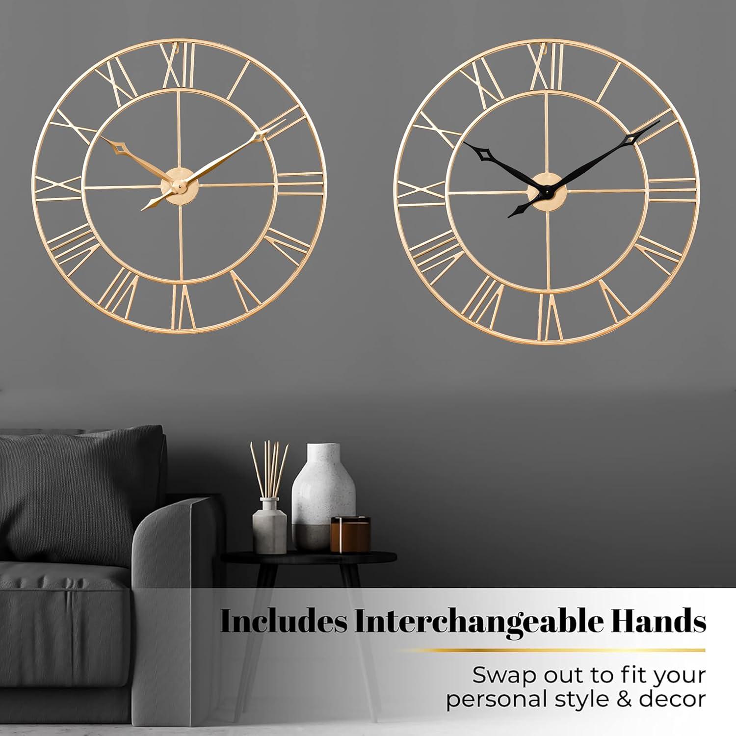 - [Easy to Read and Hang]-30" (75cm) Oversized large Roman numerals in contrast with aluminum large hands for easily reading. Simple design with a good performance. Package Comes with 1 set extra color interchangeable Clock Hands,also included Invisible Nail Hangers for hanging