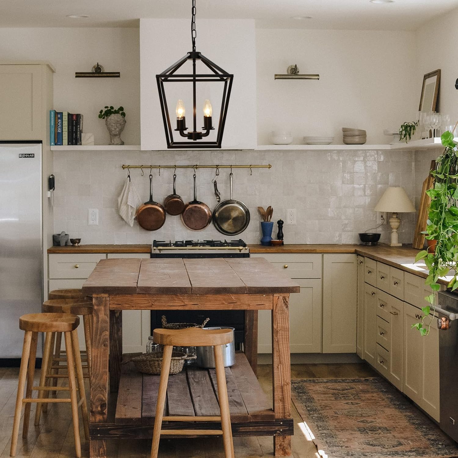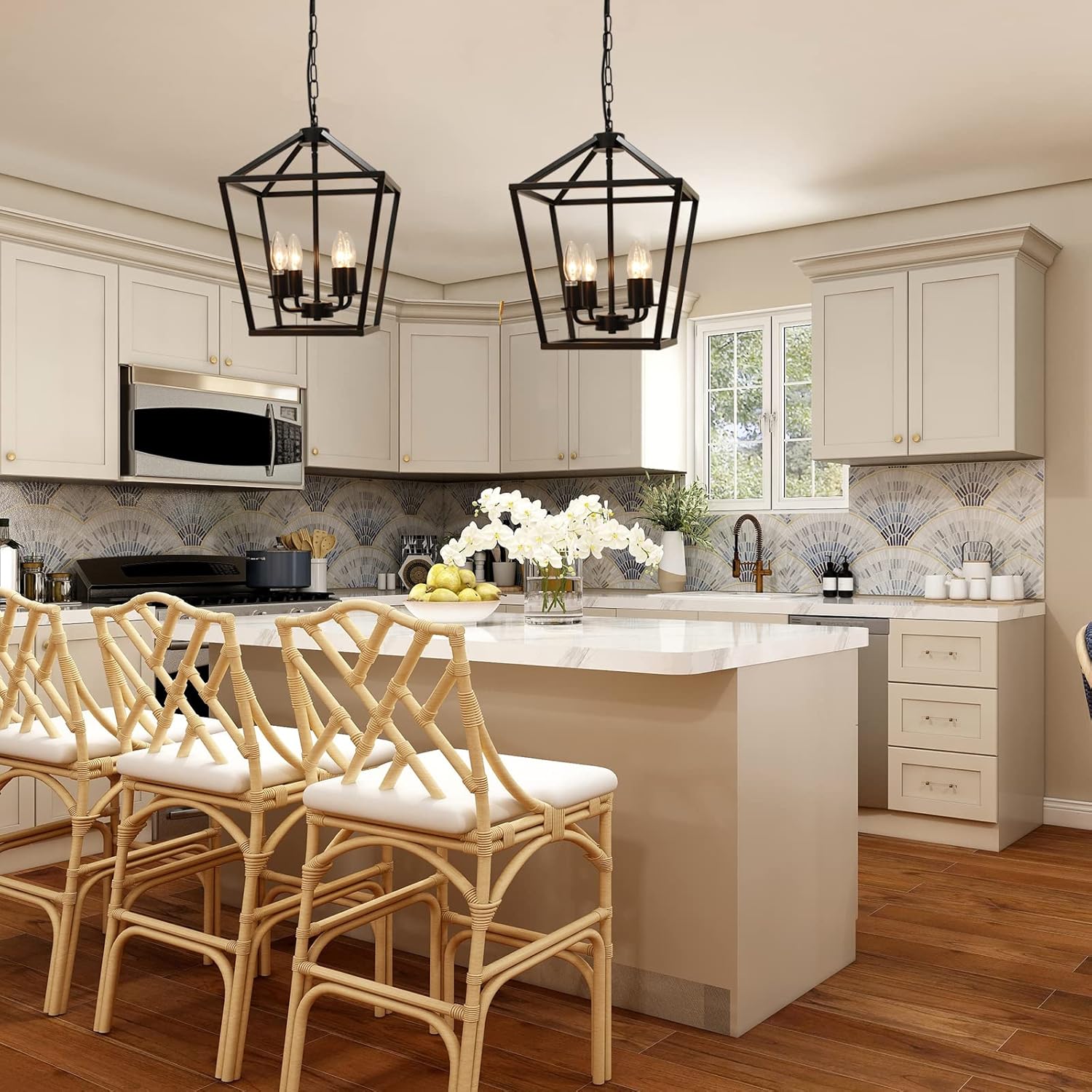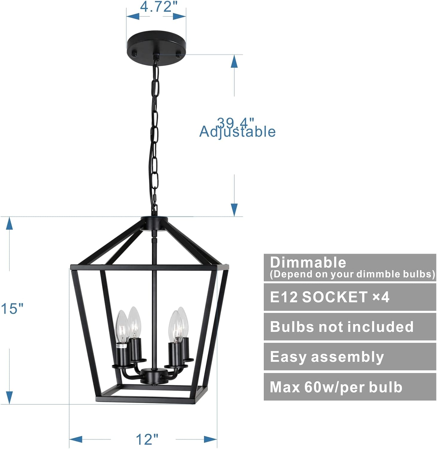 4-Light Lantern Pendant Light,Modern Industrial Black Cage Farmhouse Chandelier for Kitchen Island,12'' Rustic Metal Hanging Lighting Fixture for Dining Room Bedroom Foyer Entry Porch