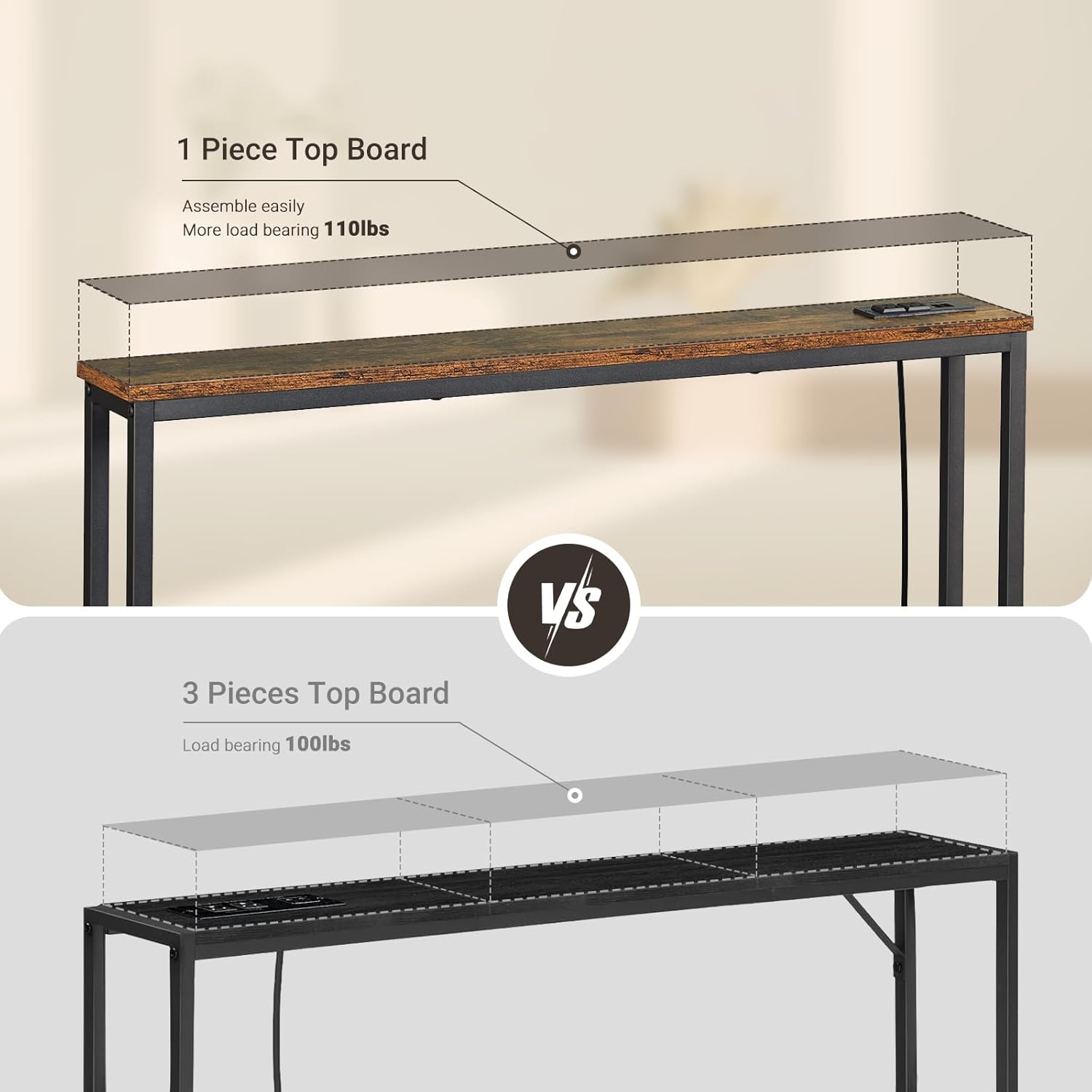 - Back Sofa Table with Outlets: The narrow long table with 2 standard 120VAC outlets, 2 USB ports and 6.5 feet long power cord to rescue the socket behind the sofa to charge the laptop/mobile phone