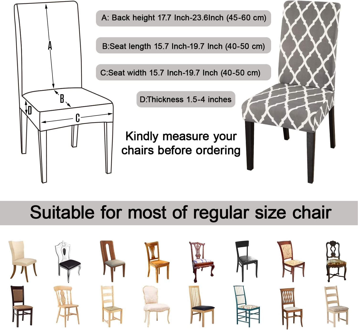- 【Suitable for Chair Size】- Chair back height 17.7 Inch-23.6Inch (45-60 cm), chair-back width 15.7 Inch-19.7 Inch (40-50 cm),Inch Chair seat length and width 15.7 Inch-19.7 Inch (40-50 cm).Thickness 1.5-4.5Inch (4-12 cm). Please check the measurement guide in the item picture before order..(Please allow 0.5-1 inch error due to manual measurement.)