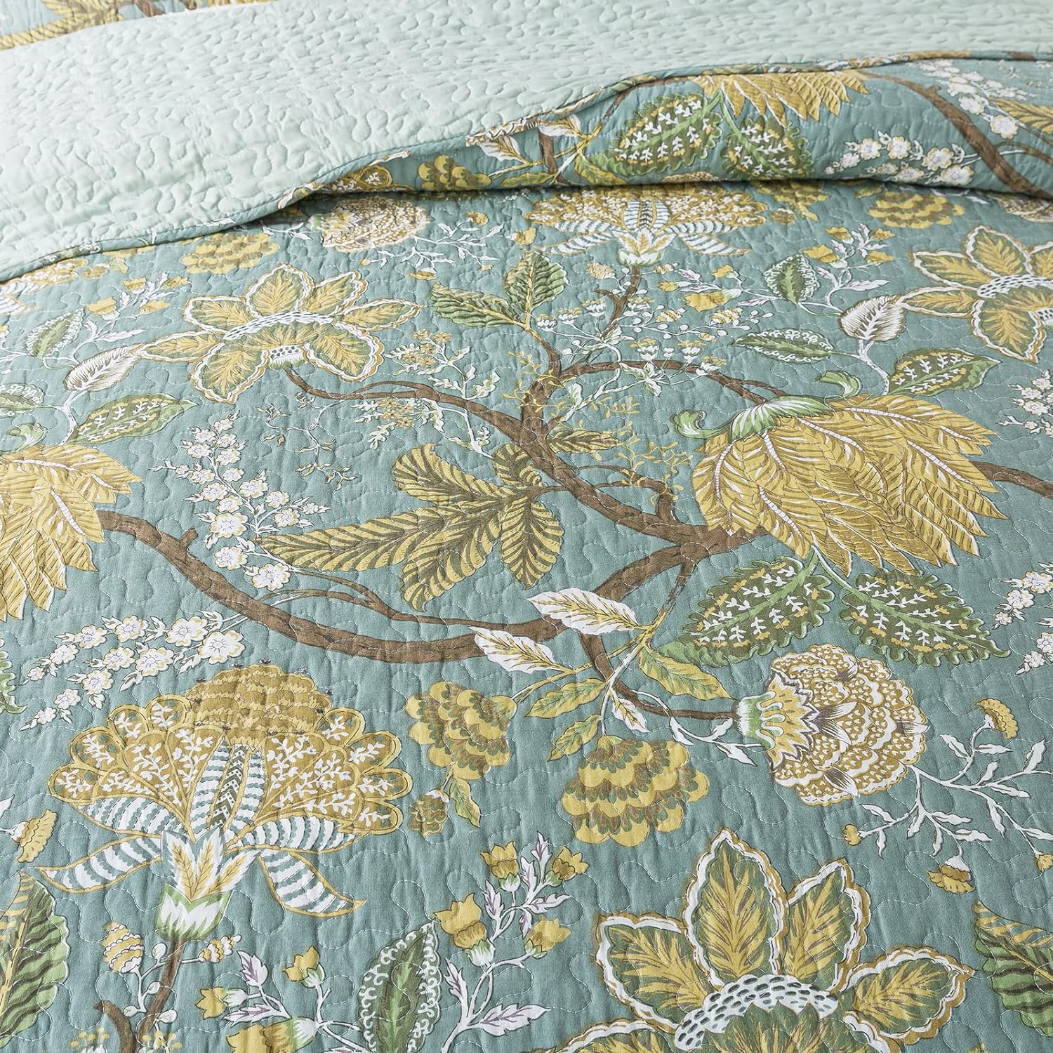 NEWLAKE Cotton Bedspread Quilt Sets-Reversible Patchwork Coverlet Set, Green Floral Pattern, Queen Size