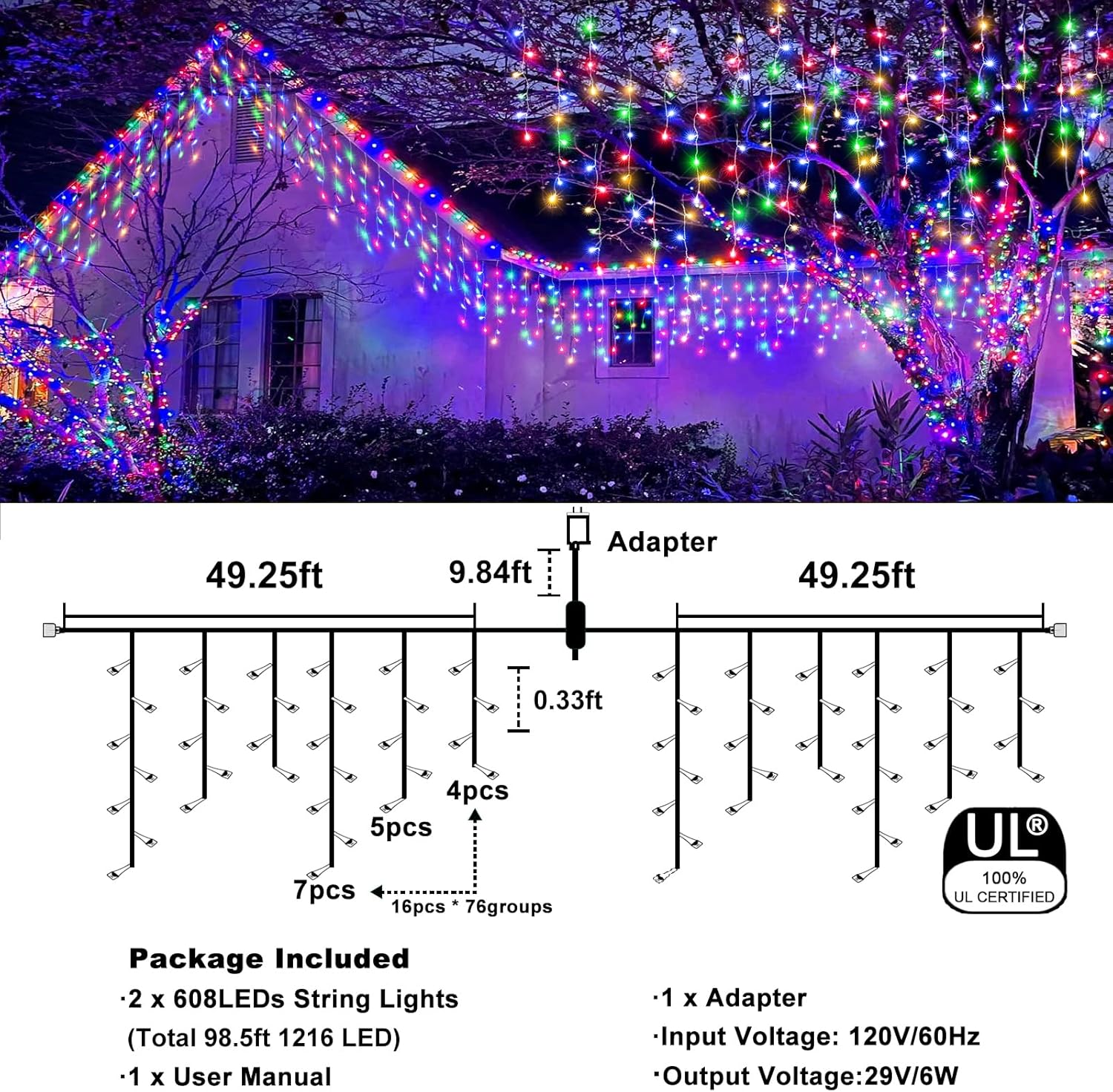 - [IP44 Waterproof & UL Certified] - These icicle hanging lights are equipped with a safe 29V low voltage UL certified plug and robust clear wire that can better avoid overheating which is corrosion resistant, aging resistant. IP44 waterproof design make the lights are suitable for use even in rainy or snowy. Please note that the power adapter is not waterproof.