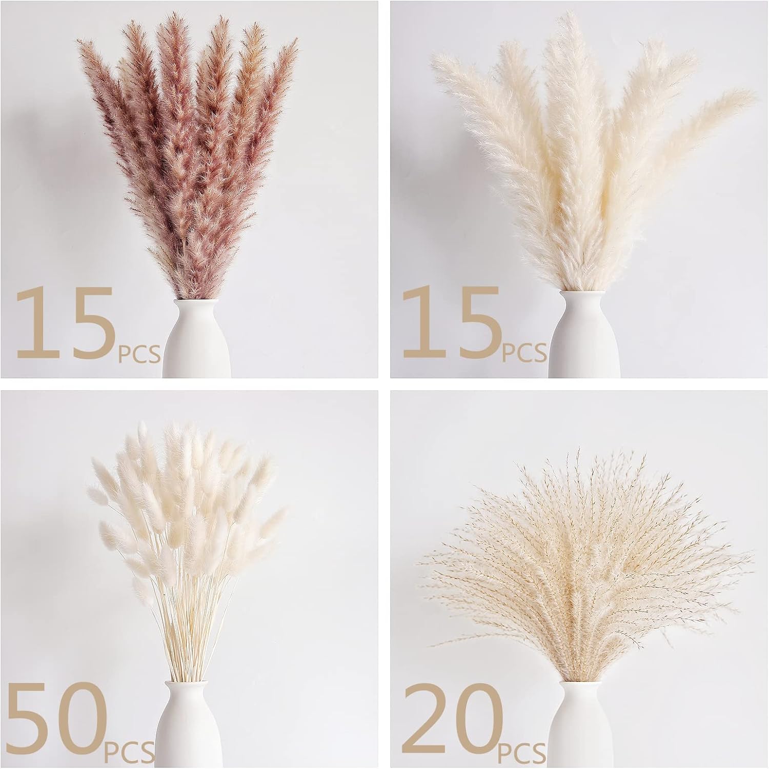 - MORE THAN ONE KIND OF POMPOUS GRASS BOUQUET: carefully selected natural dried pampas grass decor, try to avoid deformation and breakage of dried pampas grass, 100 pieces of pampass grass contain 50 white small pampas grass, 20 reed grass, 15 white pompas, 15 brown pompass grass branches(pampas grass vase not included) fill your vase, you can match it with different dried pompas floral bouquets according to your preference