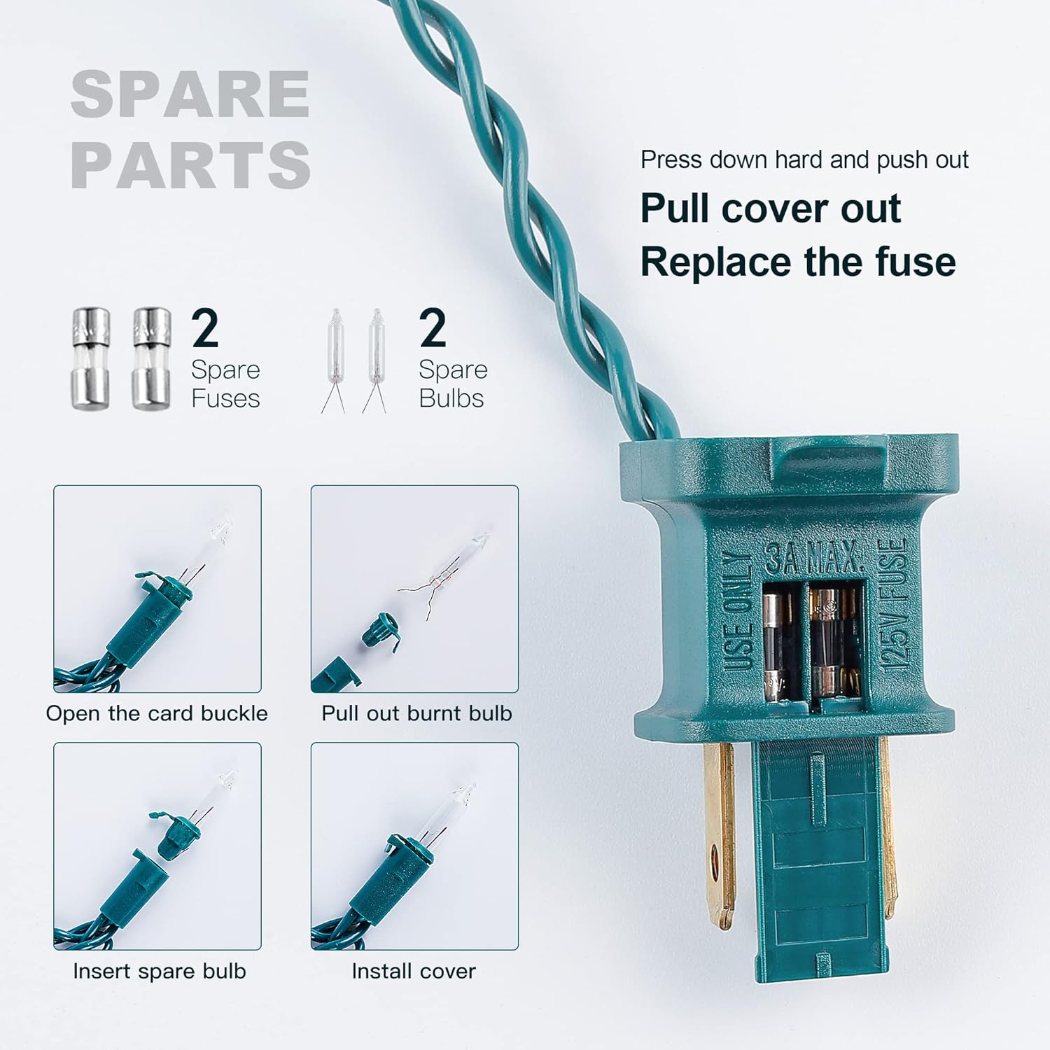 - ๐ฒUnique Design Christmas Lights: The bulb has a snap-on design and is very easy to replace. When one of our bulbs breaks, it doesn't affect the other bulbs. This is a very special design. You can replace damaged bulbs individually with the spare bulb or fuse provided by us.