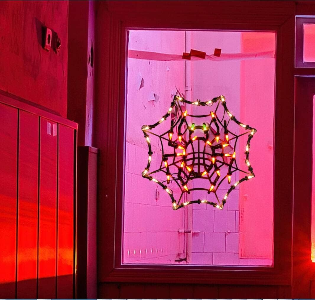 - Cobweb Halloween Window Silhouette Decoration: 50 mini lights on Brown wire,Cobweb Light measures 12.8 x 12.8 -Inch;2 pcs replacement bulbs,1 flasher bulb, 2pcs spare fuses,2 pcs zip ties and 1 pc suction cup included.
