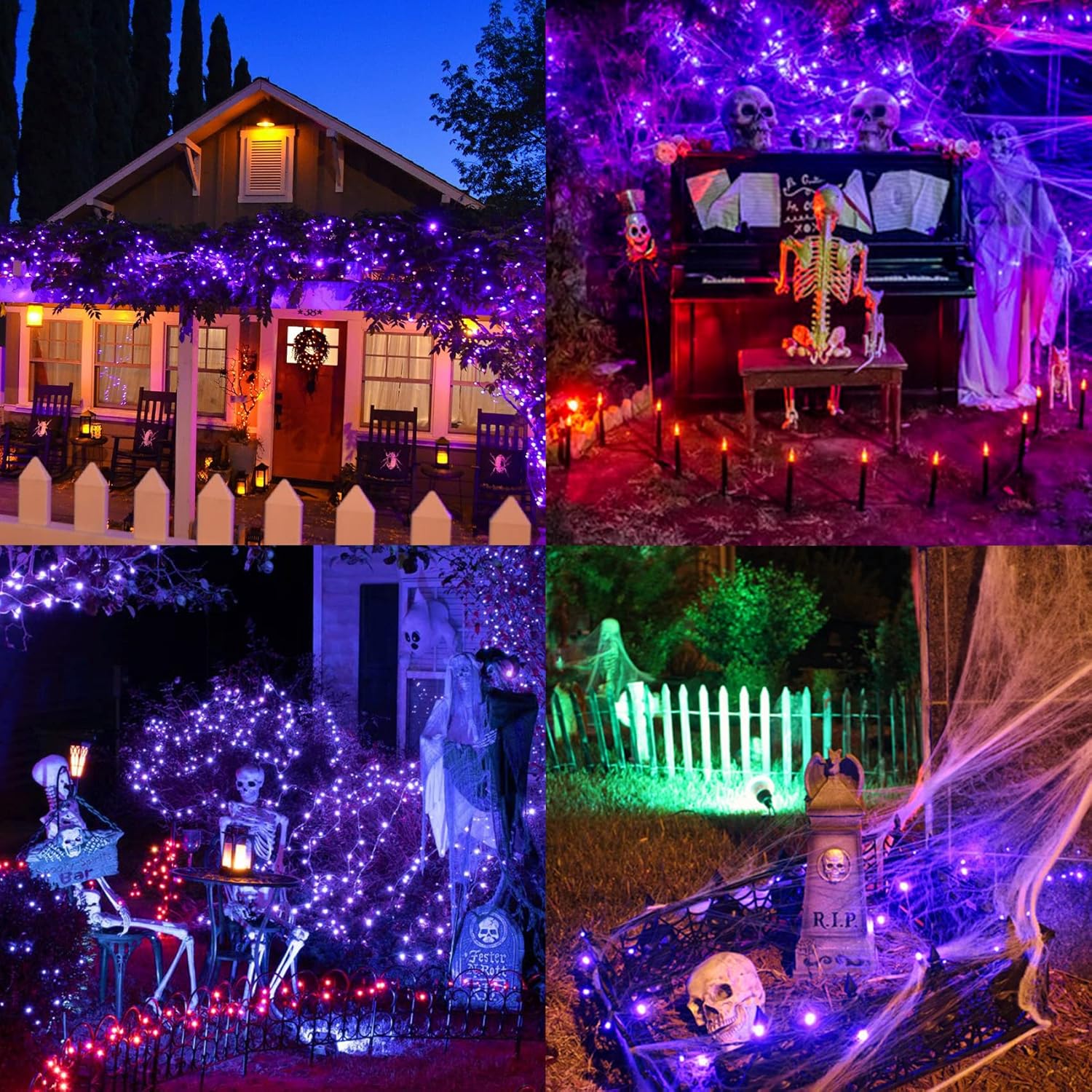 - 【300 LED Halloween Music Lights】The smart 300 bright LED purple Halloween lights built-in high sensitivity motion sensor, which will be sync with the rhythm of Halloween spooky sounds. The total length is 114.8 ft with dark green wire, which is large enough to cover the bush, fence or fireplace with a decent amount of lights. Approximately 16.4 ft lead cable which is long enough to plug in the power supply from anywhere. Add a little creepiness to your Halloween decor this year.