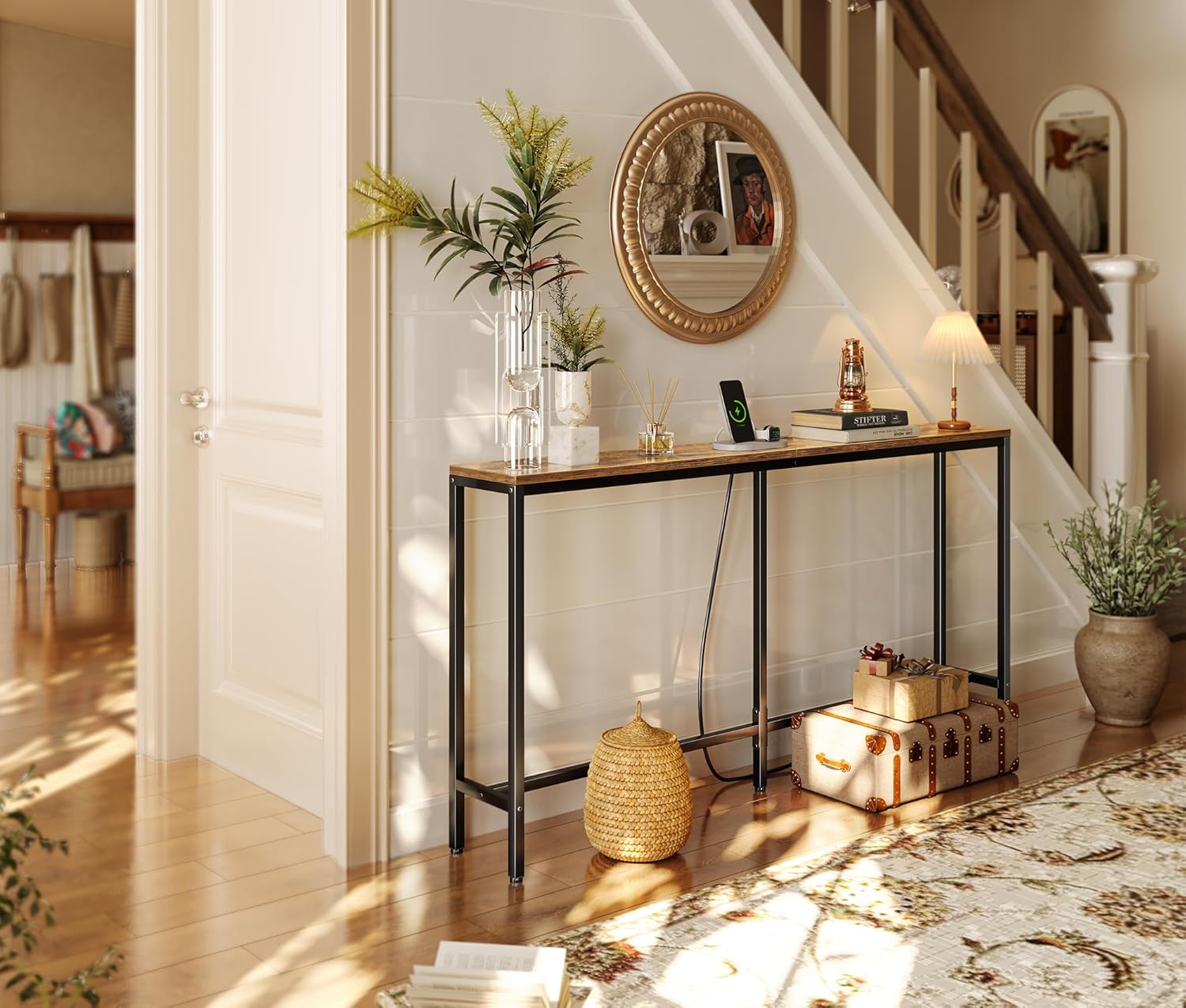 SUPERJARE Console Table with Outlet, 63 Inch Sofa Table with Charging Station, Narrow Entryway Table, Behind Couch Table, for Living Room, Plants - Rustic Brown