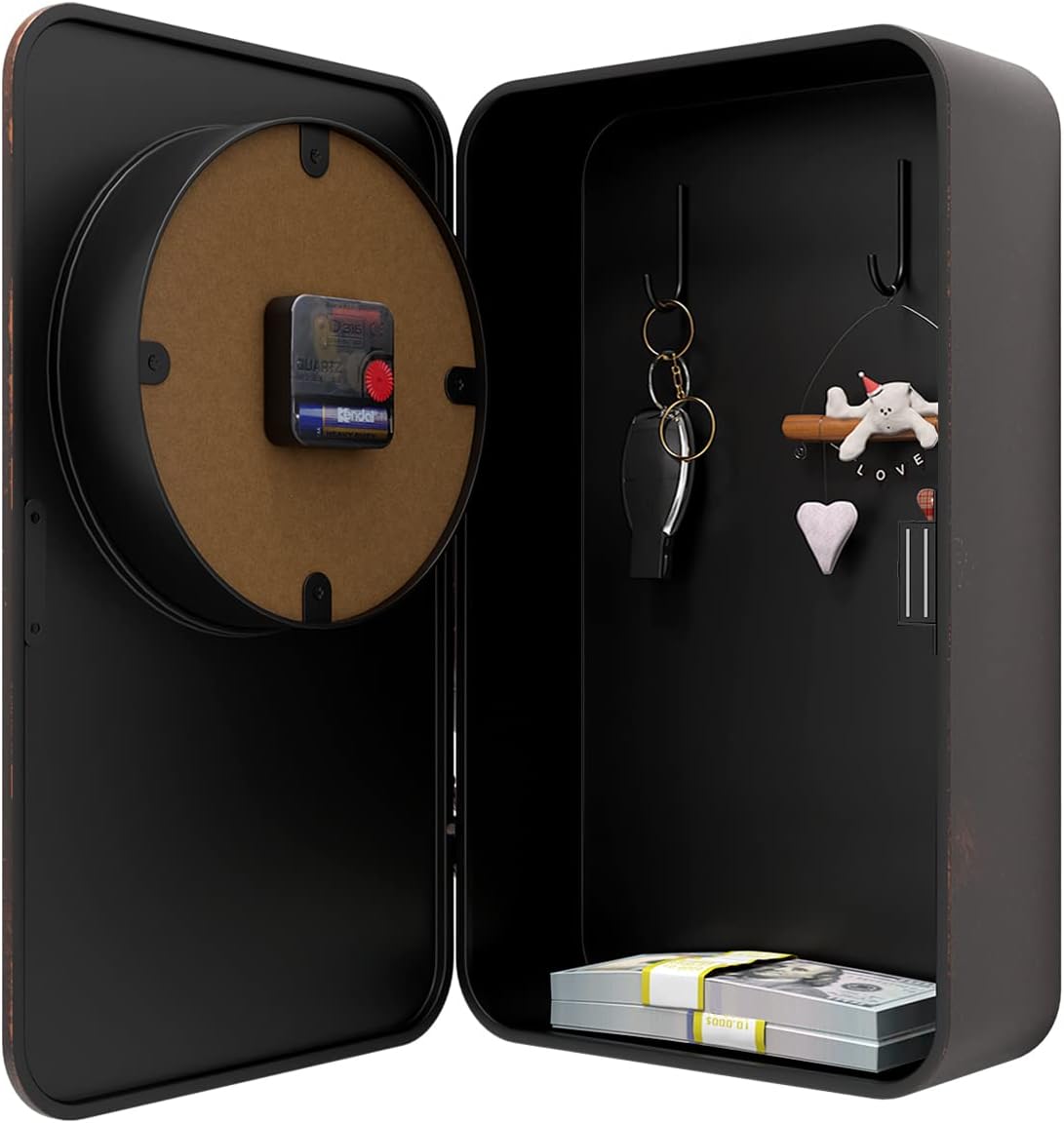 - WALL CLOCK DETAILS : Abdurey hand crafted, the case frame is cut from thick steel plate and baked with lacquer to prevent rusting, the hands are made of aluminum and the lens is a high definition tempered glass lens that is easy to clean and keeps dust away from the dial. The 2-slot design on the back provides easy mounting with just 2 seamless hooks (included) for simple hanging and easy opening and closing of the safe.