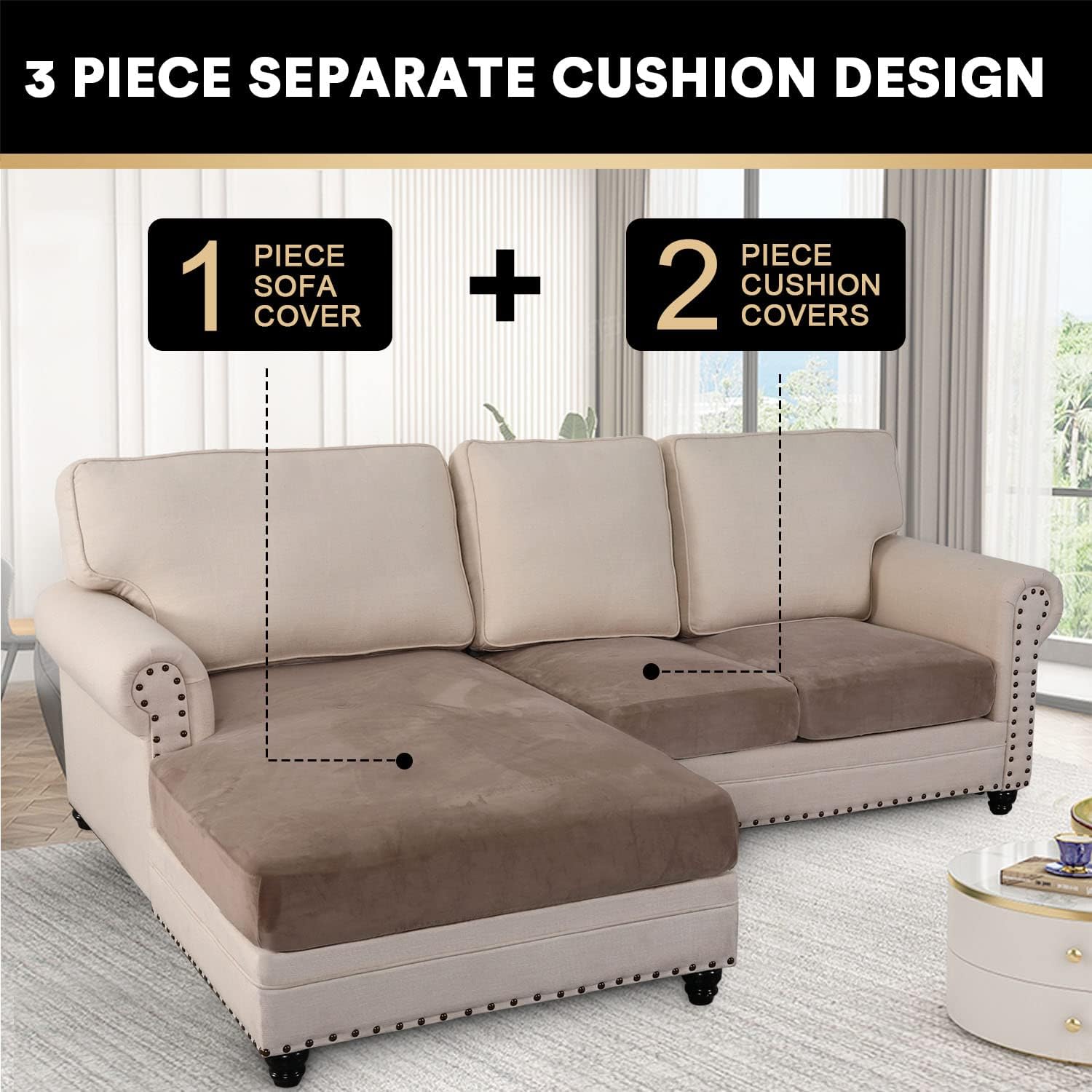PrinceDeco Sectional Couch Covers 3 Pieces Velvet Sofa Covers L Shape Soft Couch Covers for Sectional Sofa Corner Sofa Cover Couch Cover for Dogs Washable (2 Seater + 1 Chaise,Taupe)