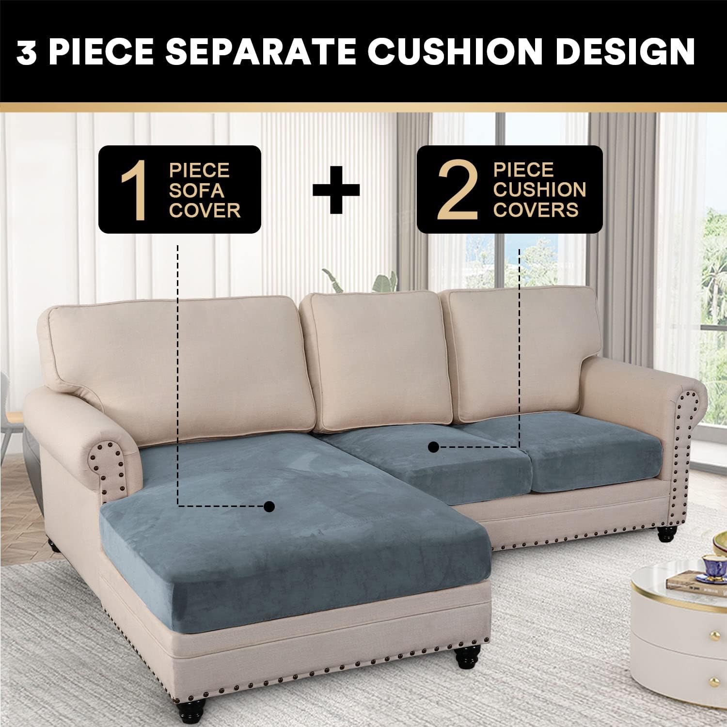 PrinceDeco Sectional Couch Covers 3 Pieces Velvet Sofa Covers L Shape Soft Couch Covers for Sectional Sofa Corner Sofa Cover Couch Cover for Dogs Washable (2 Seater + 1 Chaise,Stone Blue)