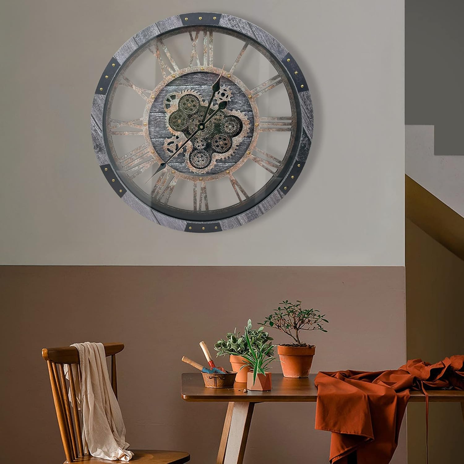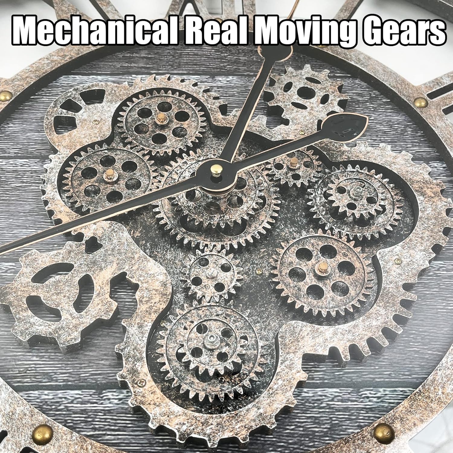 - Real Moving Gears Wall Clock: The 24 inch rustic wall clock is design with multi-real moving gears, put battery in, various gears start working, makes a subtle relaxing sound and makes a living element in the environment in where it is placed, vintage and magical, catch all eyes of visits