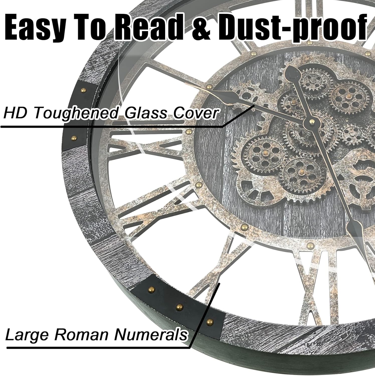 DORBOKER 24" Large Wall Clock with Moving Gears,Oversize Vintage Industrial Rustic Farmhouse Clocks for Living Room Decor Office Home,Solid Wood HD Tempered Glass Cover,Carbon Grey