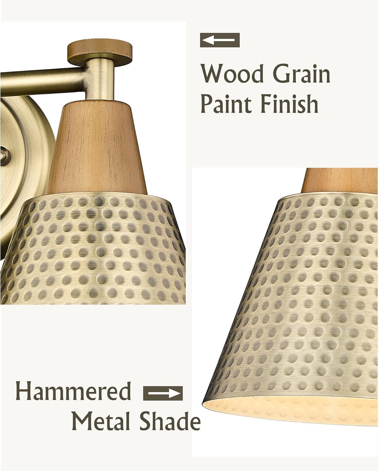 - 【Modern & Industrial Design】The bathroom light is made of sturdy metal in Matte antique brass finish which no need to worry about getting oxidation and color fading. Additionally, the hammered shades emit aesthetic and ample glow to create a beautiful lighting atmosphere outside your home or inside your room.