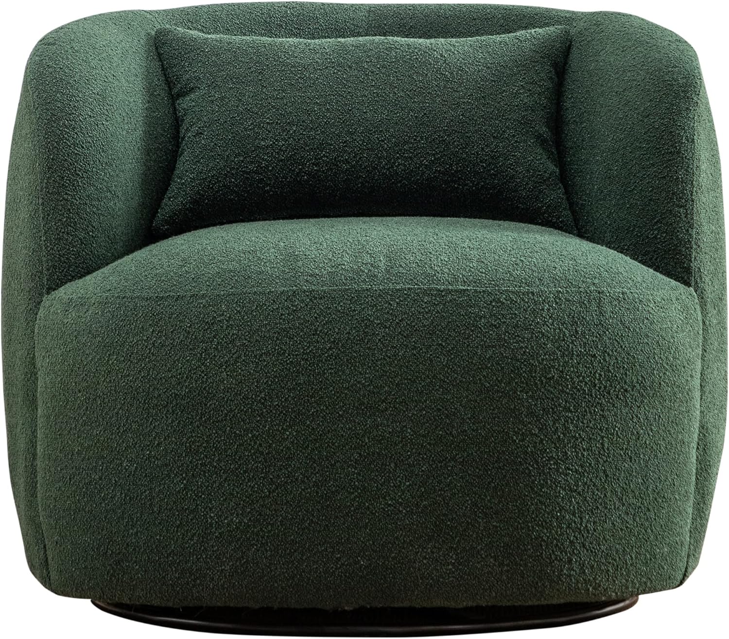 KINWELL 34" Wide Boucle Swivel Barrel Chair, No Assembly Round Upholstered Armchair Accent Chair Single Sofa Chair with Toss Pillow for Living Room and Bedroom, Green