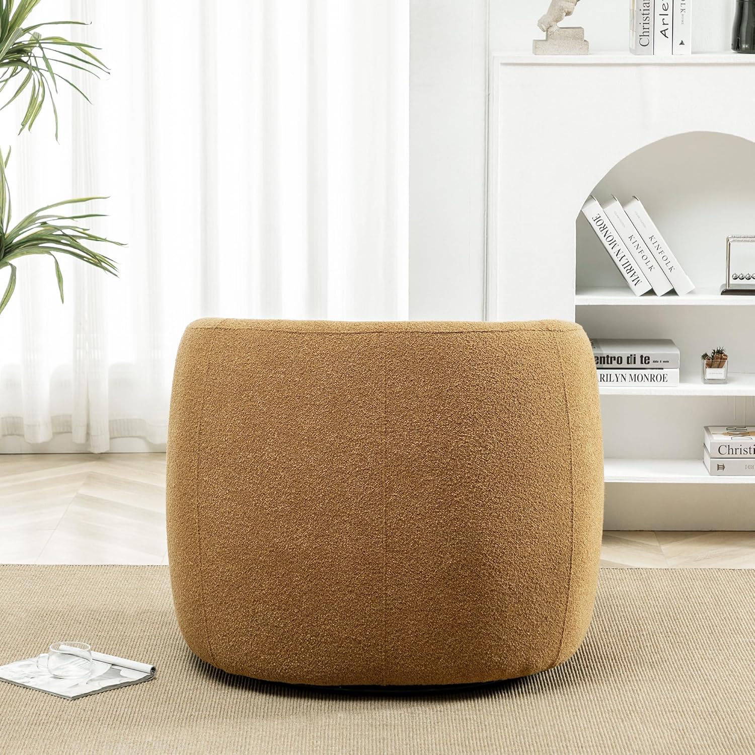 KINWELL 34" Wide Boucle Swivel Barrel Chair, No Assembly Round Upholstered Armchair Accent Chair Single Sofa Chair with Toss Pillow for Living Room and Bedroom, Brown