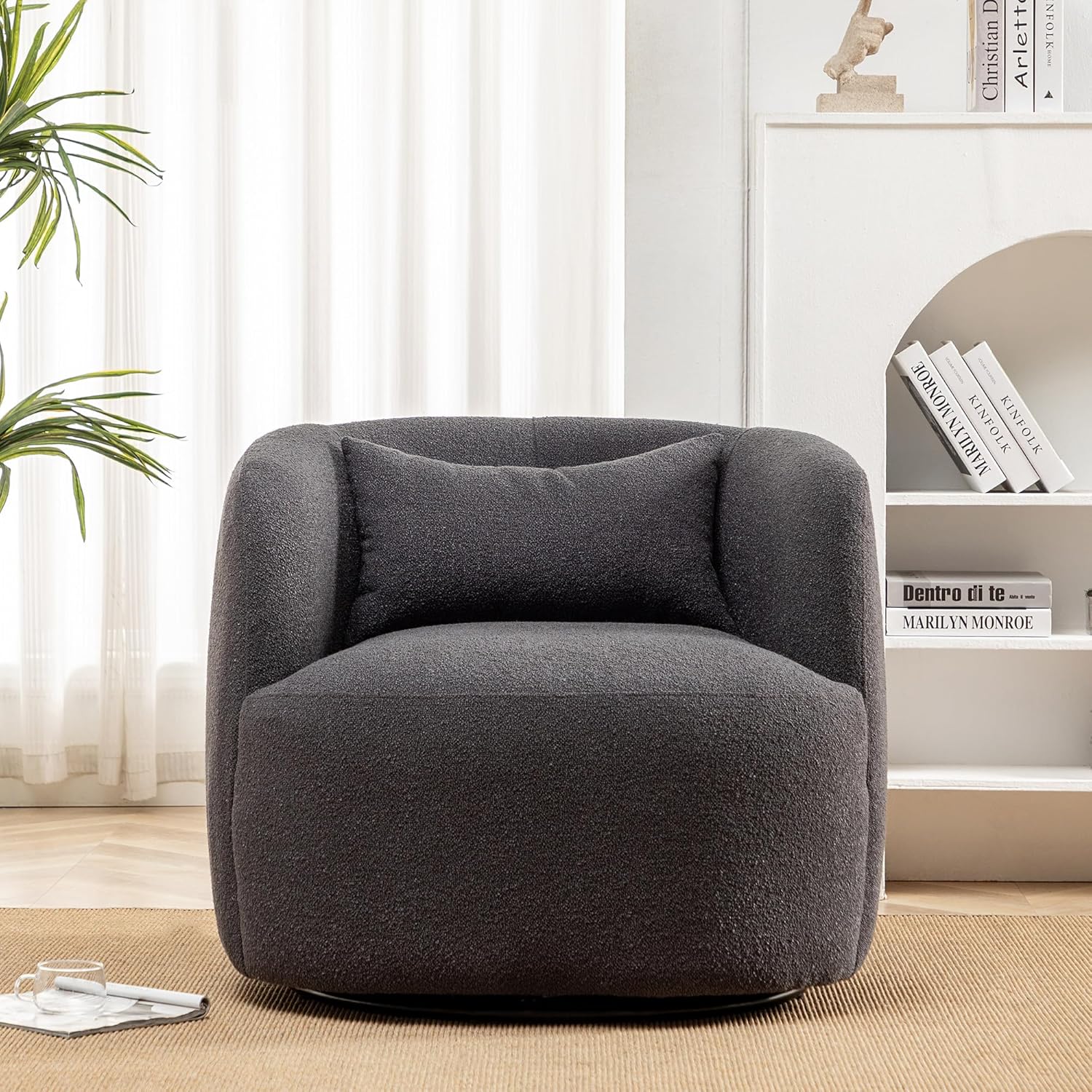 KINWELL 34" Wide Boucle Swivel Barrel Chair, No Assembly Round Upholstered Armchair Accent Chair Single Sofa Chair with Toss Pillow for Living Room and Bedroom, Dark Grey