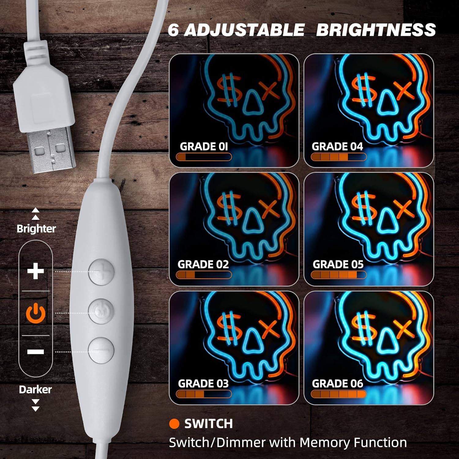 - ๐ 6 Dimmable Switch: Our skeleton neon sign has 6 adjustable light modes, making it a great wall decoration that can replace boring desk lamps and add some color to a boy's playroom. It's perfect as a birthday or Christmas gift for your family, significant other, boyfriend, kids, and more.