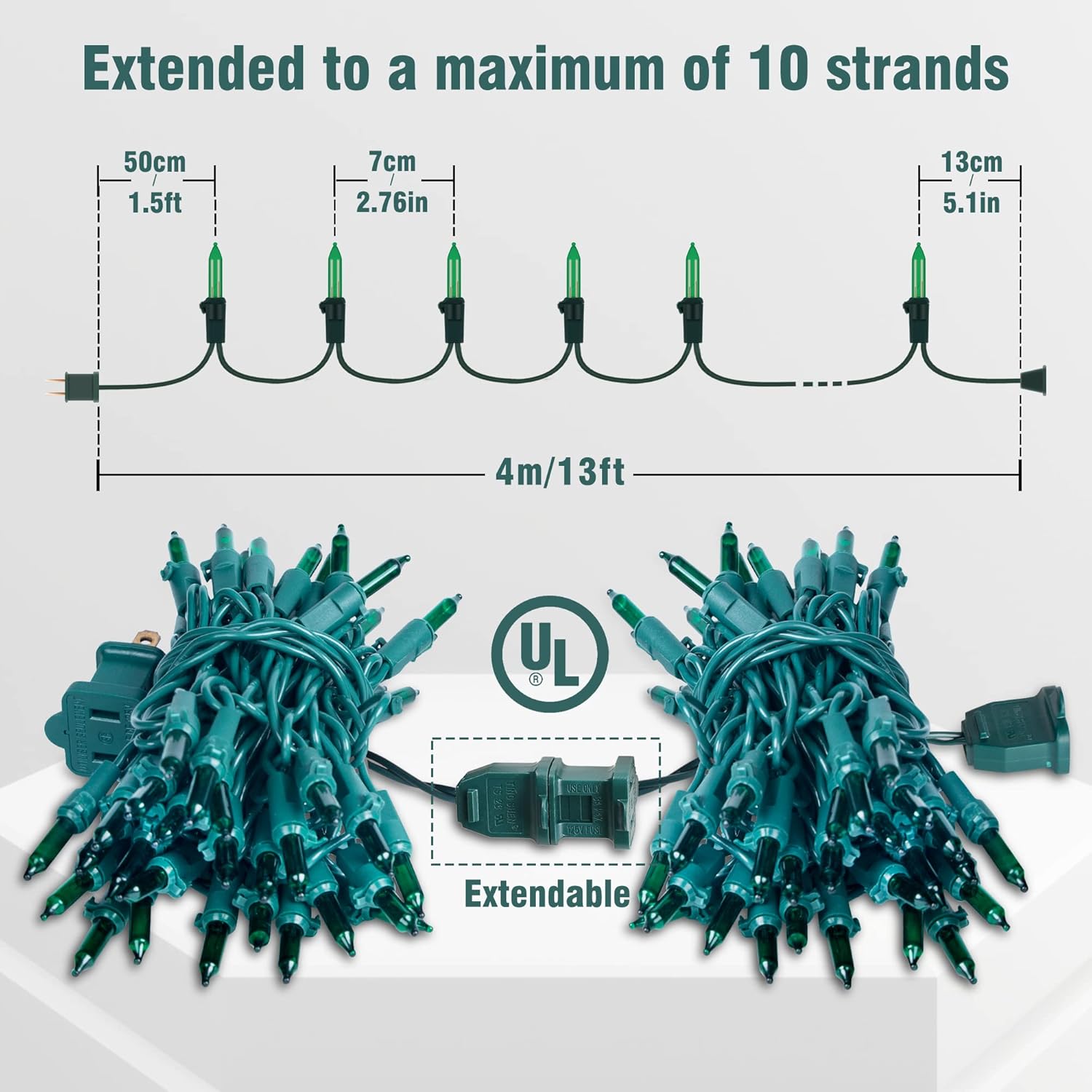 - ☘100 Incandescent Christmas Lights:Beewin Old-fashion incandescent Christmas green lights with green wire,2PACK 50Count 13Feet Clear Christmas Mini String Lights,each bulb space 2.76in.High quality UL certified products ensure the safety of you and your family.