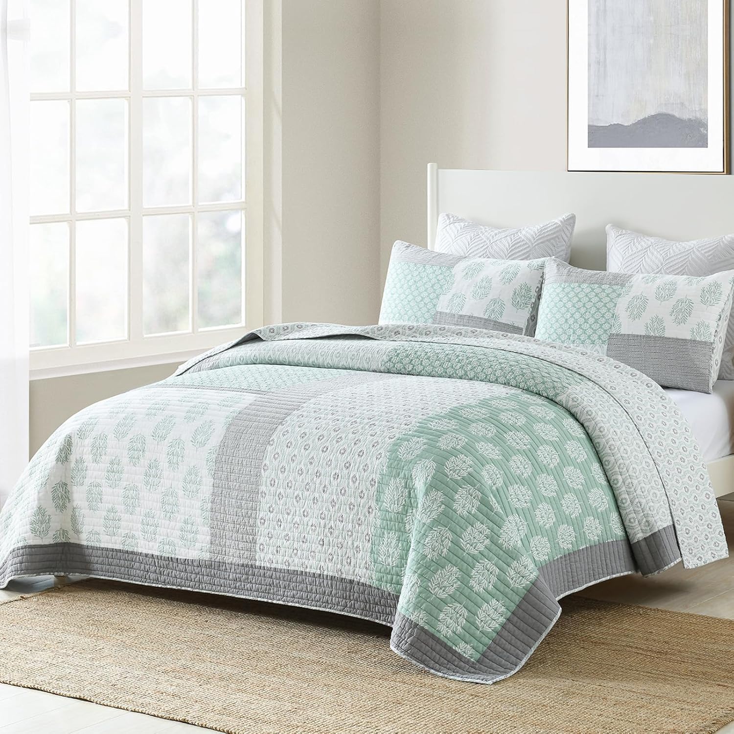 PANGUSHAN Quilt Set King Size, 100% Cotton Bedspread Quilt Bedding Set, Patchwork Reversible Floral Quilt for King Bed, Green/Grey/White Bed Spread, Lightweight Comforter for All Season, 3 Pieces