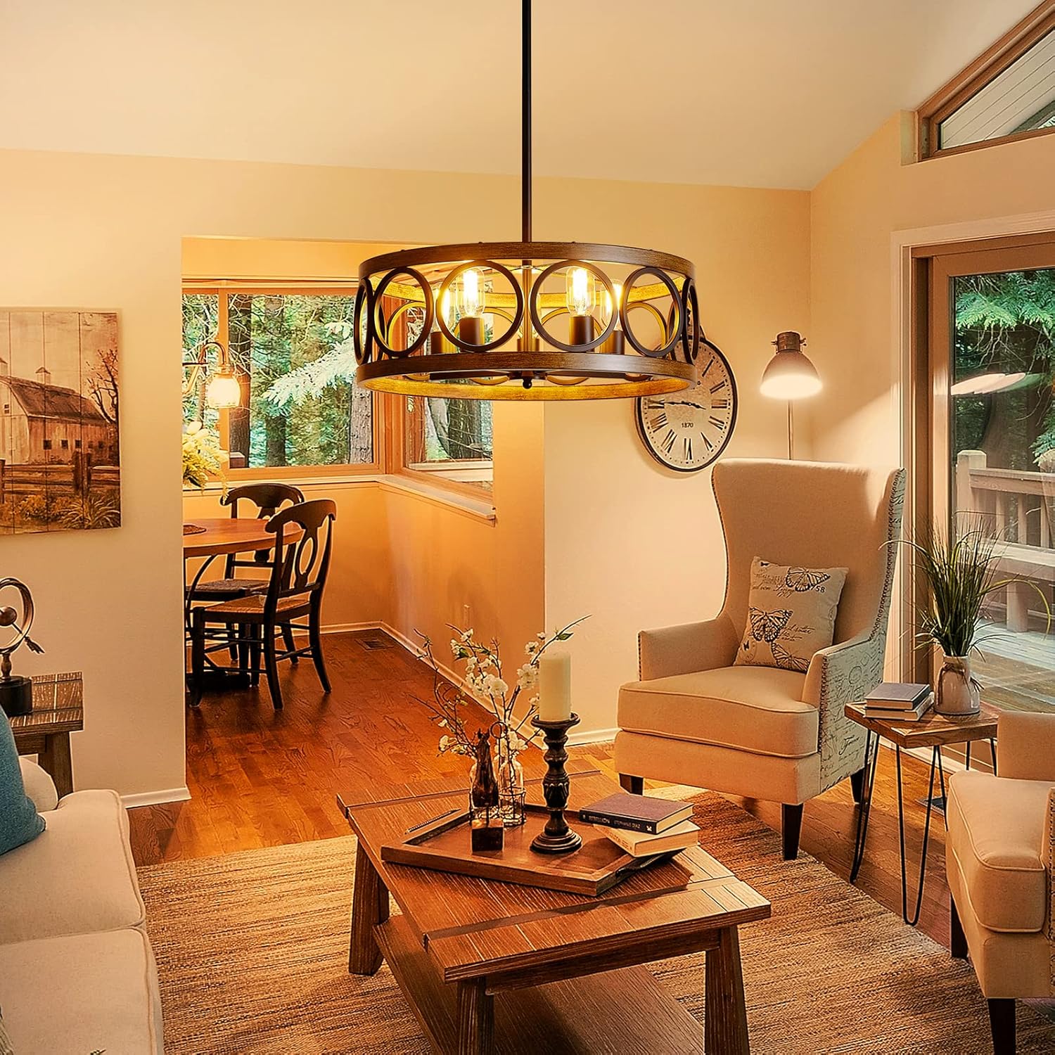 - [PERFECTLY VERSATILE] This farmhouse chandelier has a unique open drum frame with an antique wood grain and brushed nickel finish. The chandelier is made of metal, not plastic. Beautiful and durable. It will perfectly complement decorative styles from modern to farmhouse. Brighten up your home kitchen, dining room, or farmhouse style place.