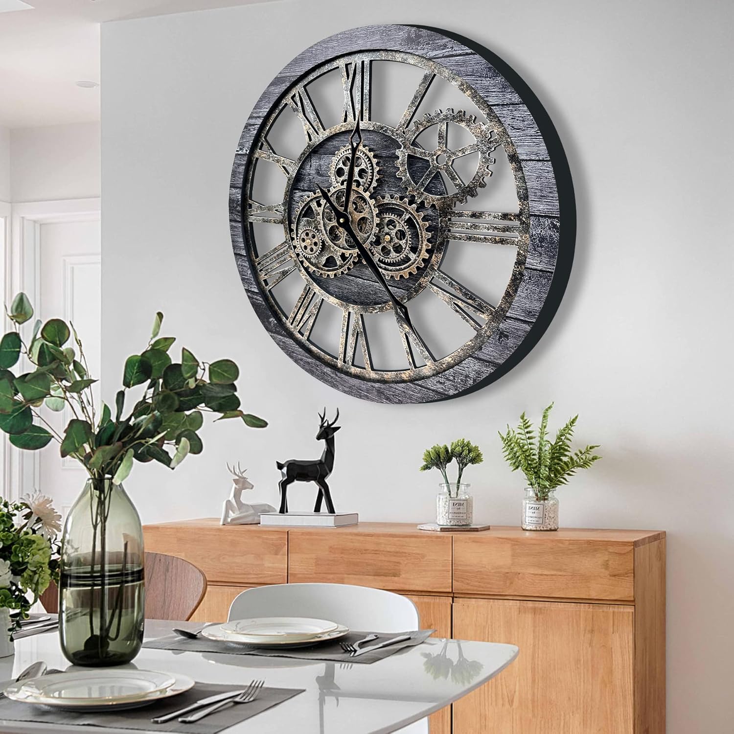 - WIDE APPLICATIONS: Oversized wall clock is not only a timepiece, but also a piece of artwork, greatly adding charm to a room, like living room, farmhouse, fireplace, bedroom or dining room, studio, gallery, loft, cafe, bar, club, etc. Rustic vintage wall clock will become an instant conversational piece for the moving gears and how cool it looks. Also awesome gifts for families or friends.