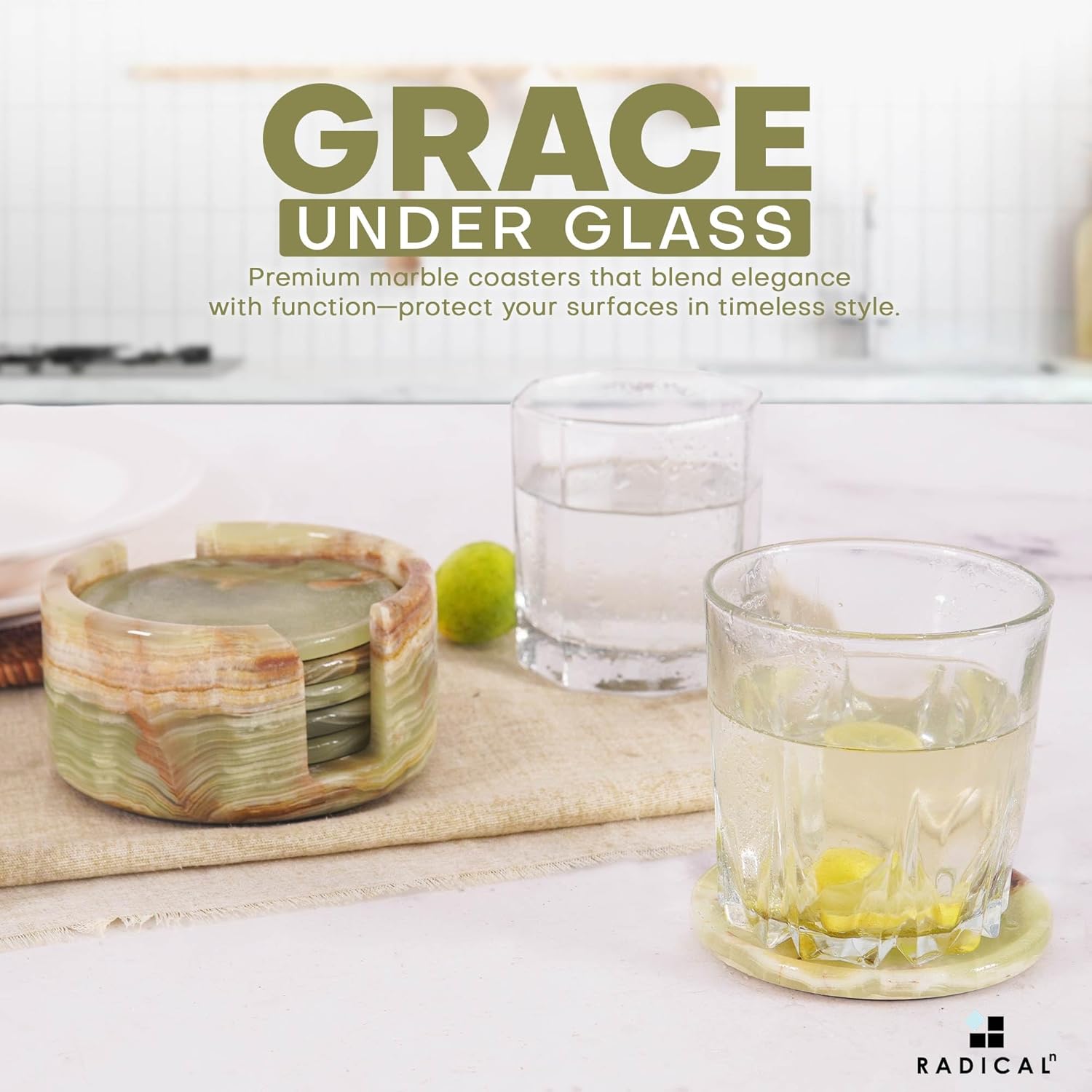 Marble Coasters Set of 6 Green Onyx 3.5 Inch Round Coaster for Drinks with Holder, Drink Coaster for Tabletop & Coffee Table Decor, Ideal Home Decor House Warming Gifts