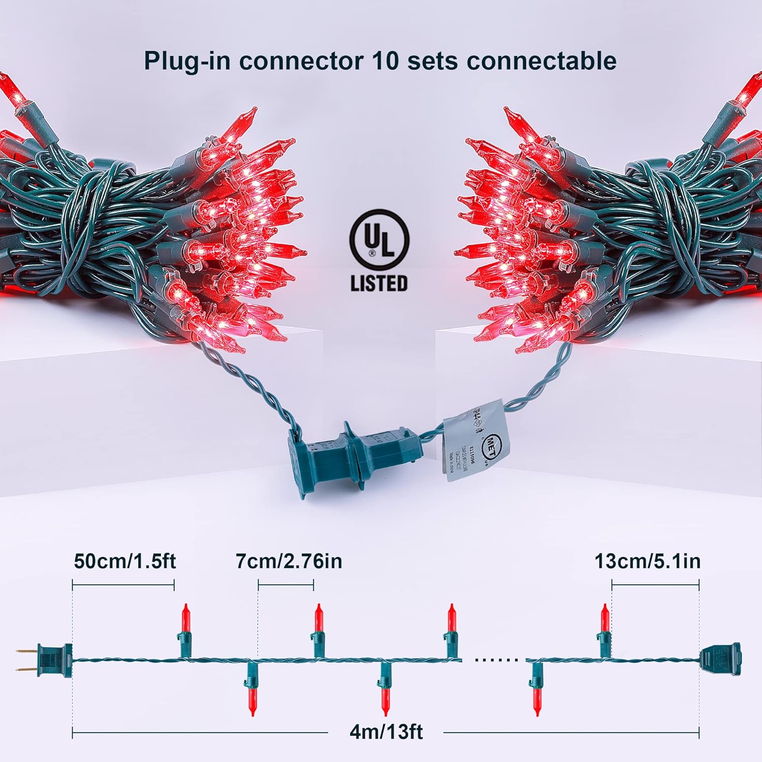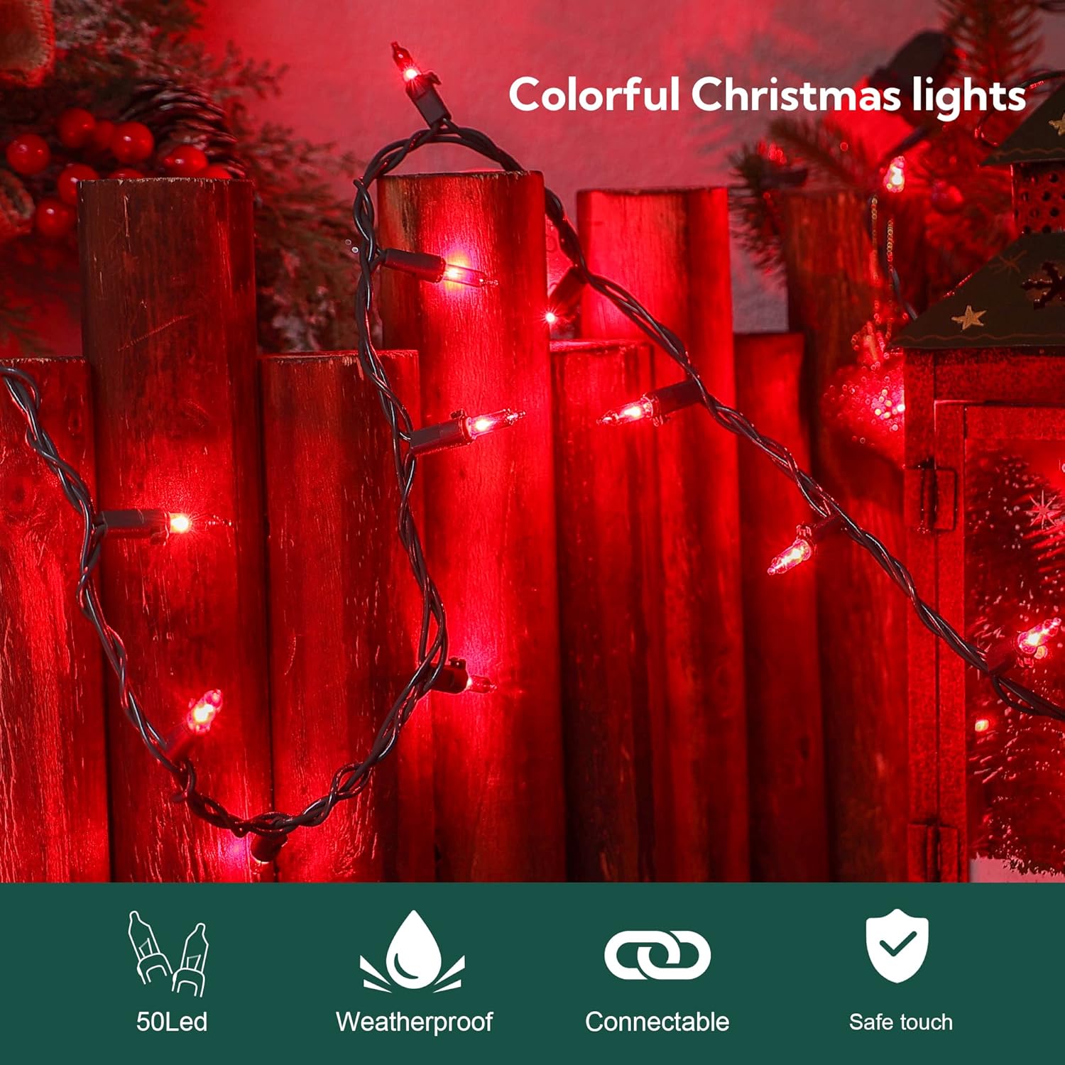 - ๐Safe to Use : 50count Red Christmas string lights are UL certified and the quality is guaranteed. Our Christmas strings lights have built-in fuses๏ผ which will protect the short circuit caused by the damaged wire and can effectively prevent the possibility of fire. High quality use rest assured. Warm tips: Please kindly protect these string lights from immersing in water and keep the plug dry.