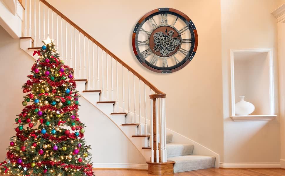 - Unique Design, Only For Your Home: Round solid Wood frame and classic retro skeleton with real mechanical moving gears in the central, the wooden frame is handcraft, showing unique attractive wood grain color and small natural knots; artificial rust-imitated treatment marks on the skeleton for vintage and industrial effect; stronger tempered glass resists any breakage and keeps safety whenever; The design is very different from other clocks, just to break the ordinary, only for your home