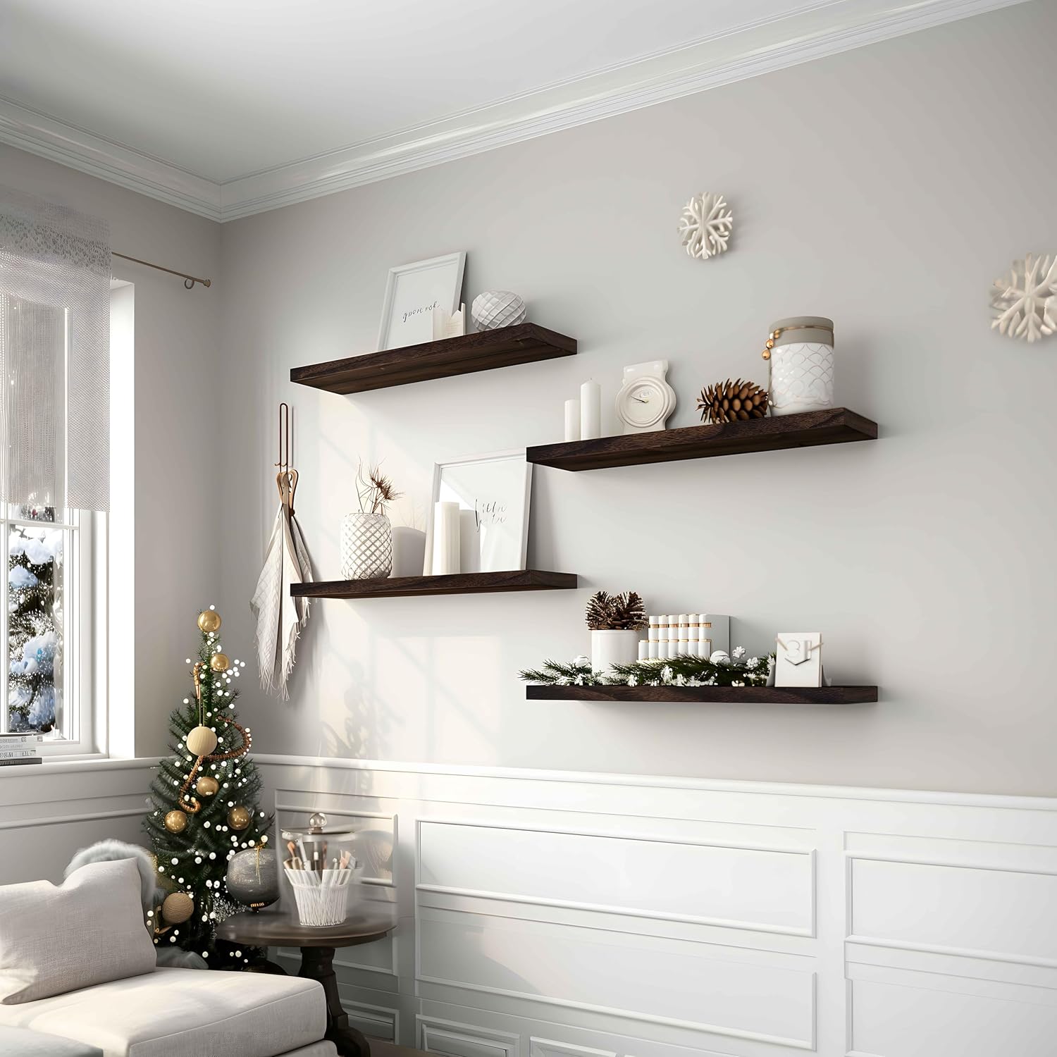 Wood Floating Shelves for Wall Decor, Rustic Wall Shelves for Bedroom Bathroom Kitchen Living Room, Set of 4 Walnut 24 Inch