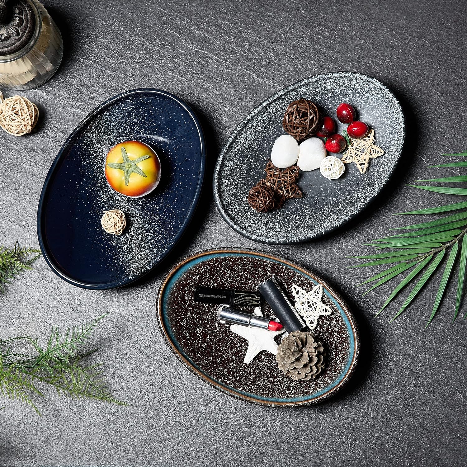 Oval Ceramic Decorative Bowl, Key Dish for Entryway Table, Small Home Decor Accent, Trinket Tray for Office Home Decor Gift (10'' Snowflake Gray without Glaze Layer)