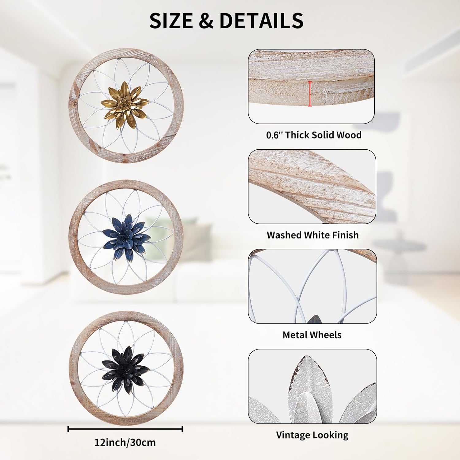 - FARMHOUSE WALL DECOR -- These 3 pcs round kitchen wall decor made of fir wood frame and metal wheels, come with 6 replaceable metal flowers, the rustic style is perfect for both modern or farmhouse home decor