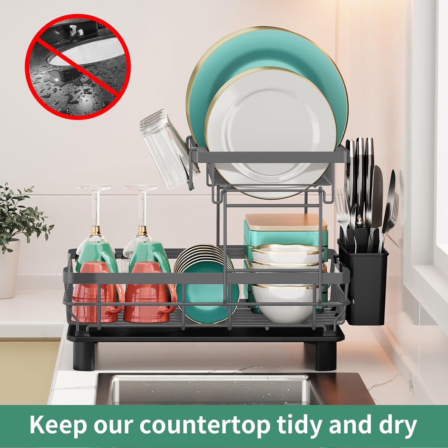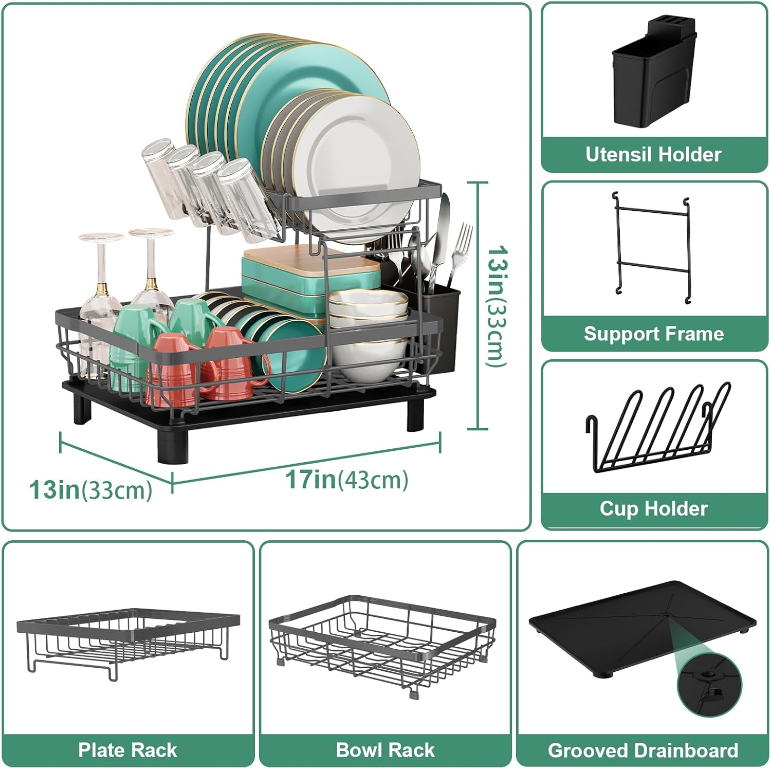 - 𝟐 𝐓𝐈𝐄𝐑 𝐋𝐀𝐑𝐆𝐄 𝐂𝐀𝐏𝐀𝐂𝐈𝐓𝐘:Our dish racks measures 16.9"D x 12.9"W x 12.9"H(43 D x 33W x 33 H cm),with plate rack,bowl rack,cup holder and silverware organizer store 10 plates,16 bowls,12 cups or glasses and lots of tableware,the dish drainers for kitchen counter is large enough for a family of 6 to use daily