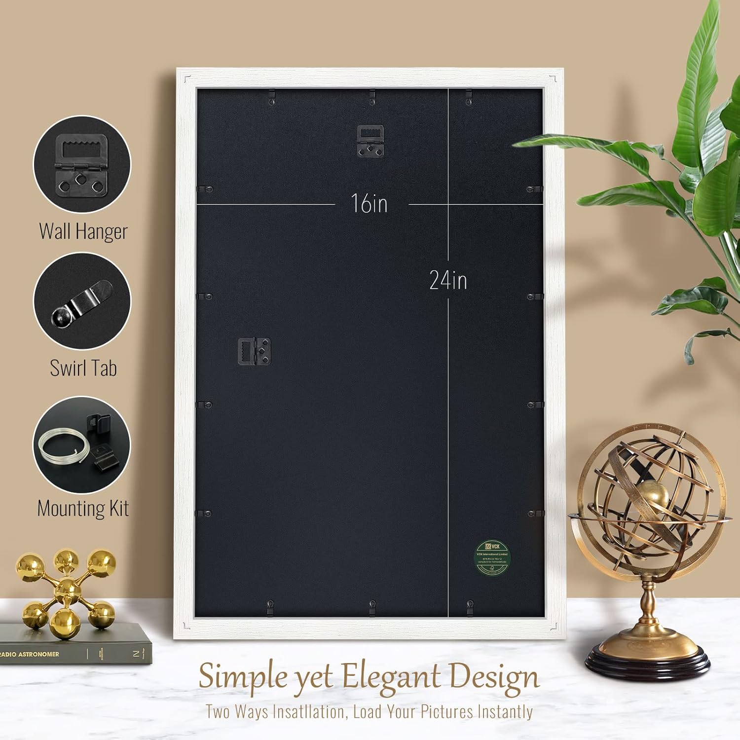 - PRODUCT FEATURES: The overall size is 25.8”x17.8” for Pictures 16x24 or 24x16, horizontal/vertical for table or wall display. Unlike others, special swirl tabs make the frame super easy to load pictures.