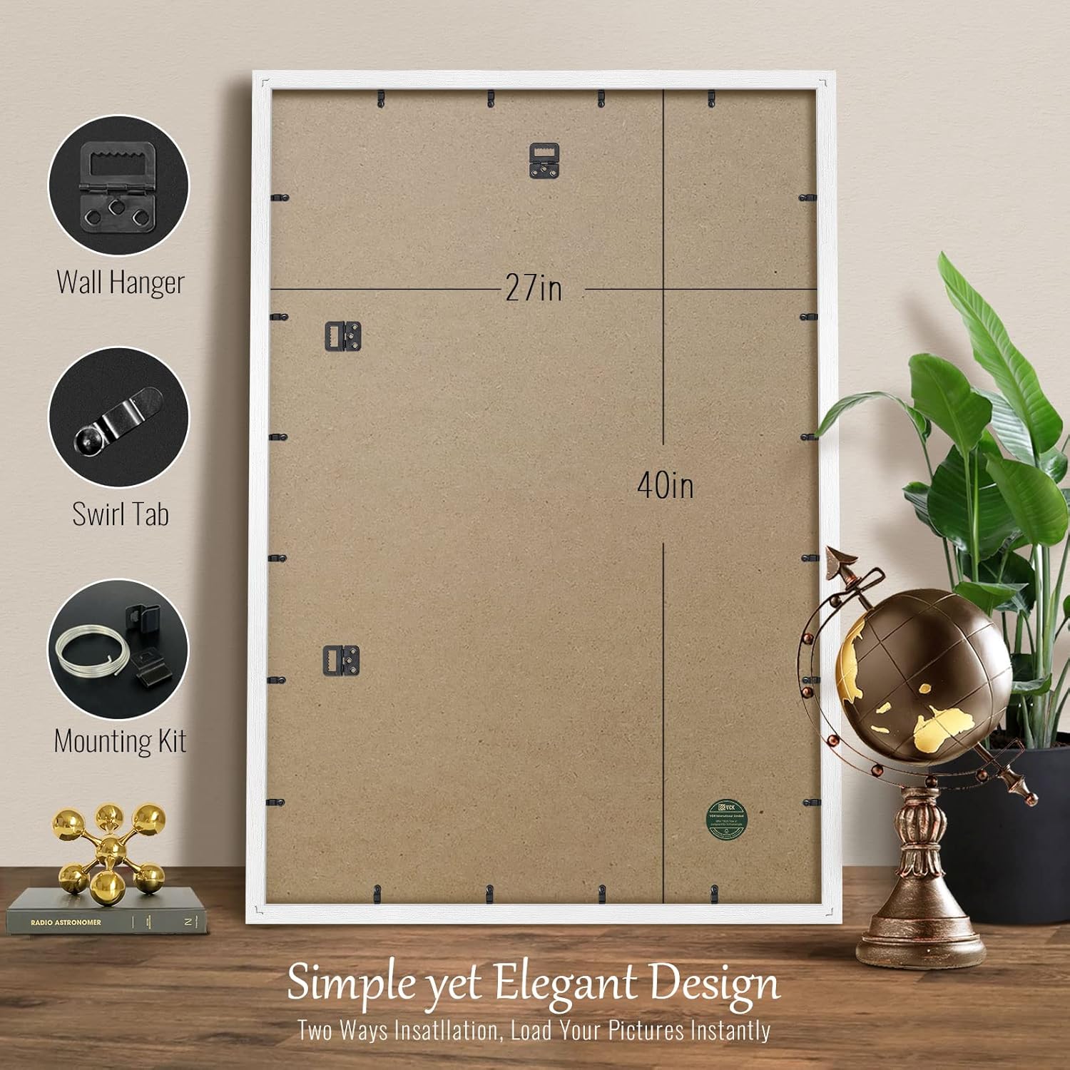 - PRODUCT FEATURES: The overall size is 41.8”x28.8” for Pictures 27x40 or 40x27, horizontal/vertical for table or wall display. Unlike others, special swirl tabs make the frame super easy to load pictures.