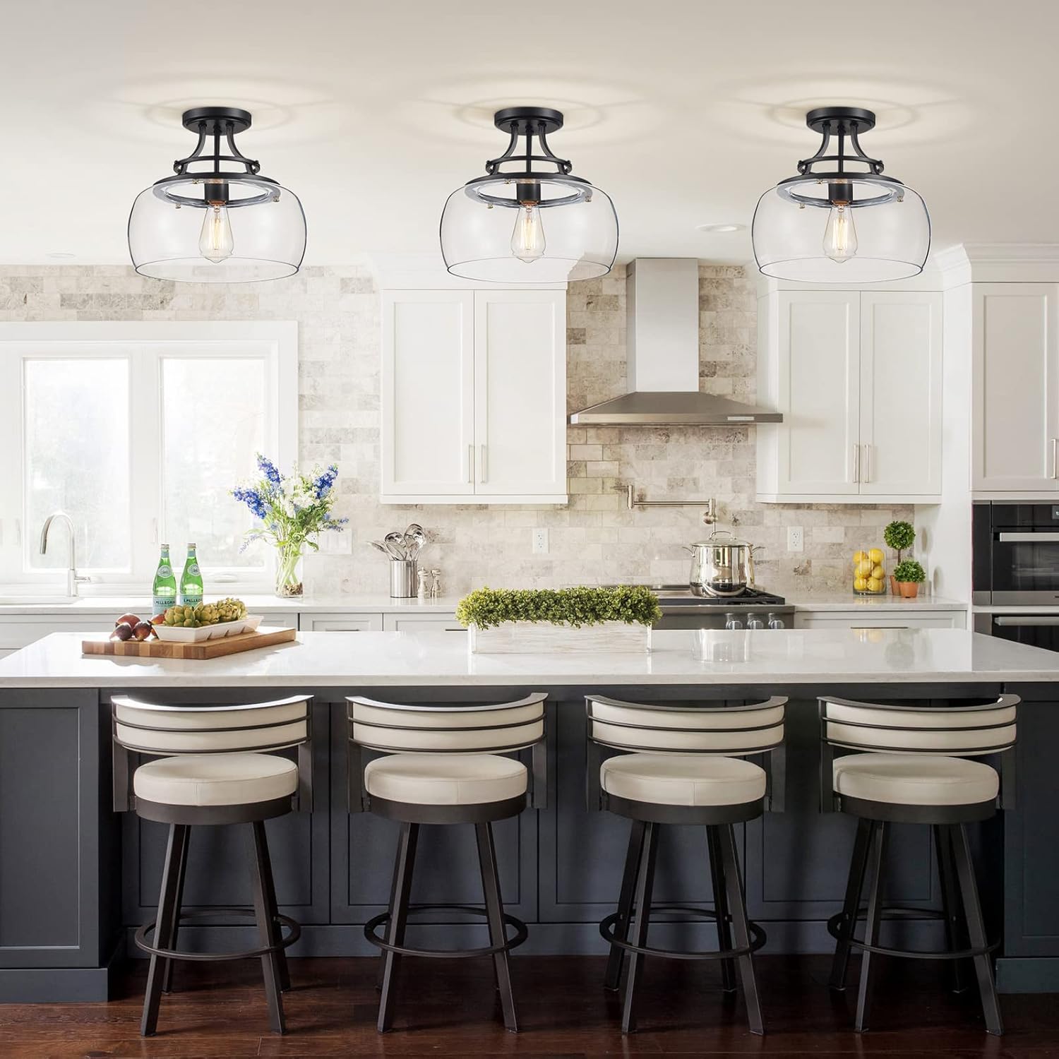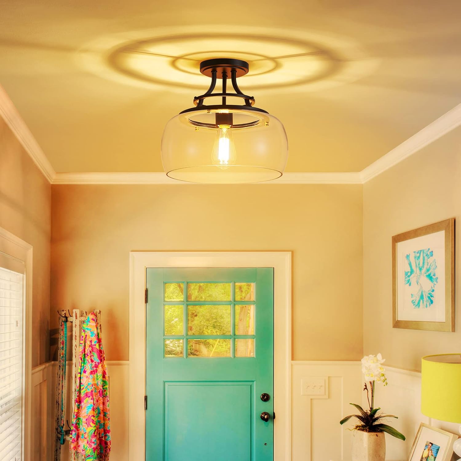 WUZUPS Chandelier Rustic Farmhouse Industrial Round Semi-flushmount Ceiling LED Light Fixture with Clear Glass Shades for Bathroom Kitchen Foyer Entryway, H 11.8" x W 13.4", E26 Base, Black