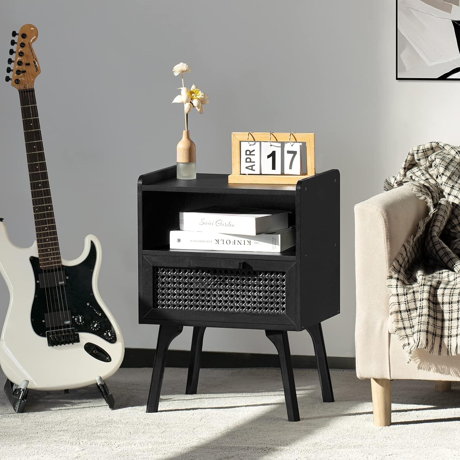 Lerliuo Rattan Nightstand, Side Table with Drawer Open Shelf, Cane Accent Bedside End Table with Solid Wood Legs, Mid Century Modern Night Stand for Bedroom, Dorm and Small Spaces (Black)