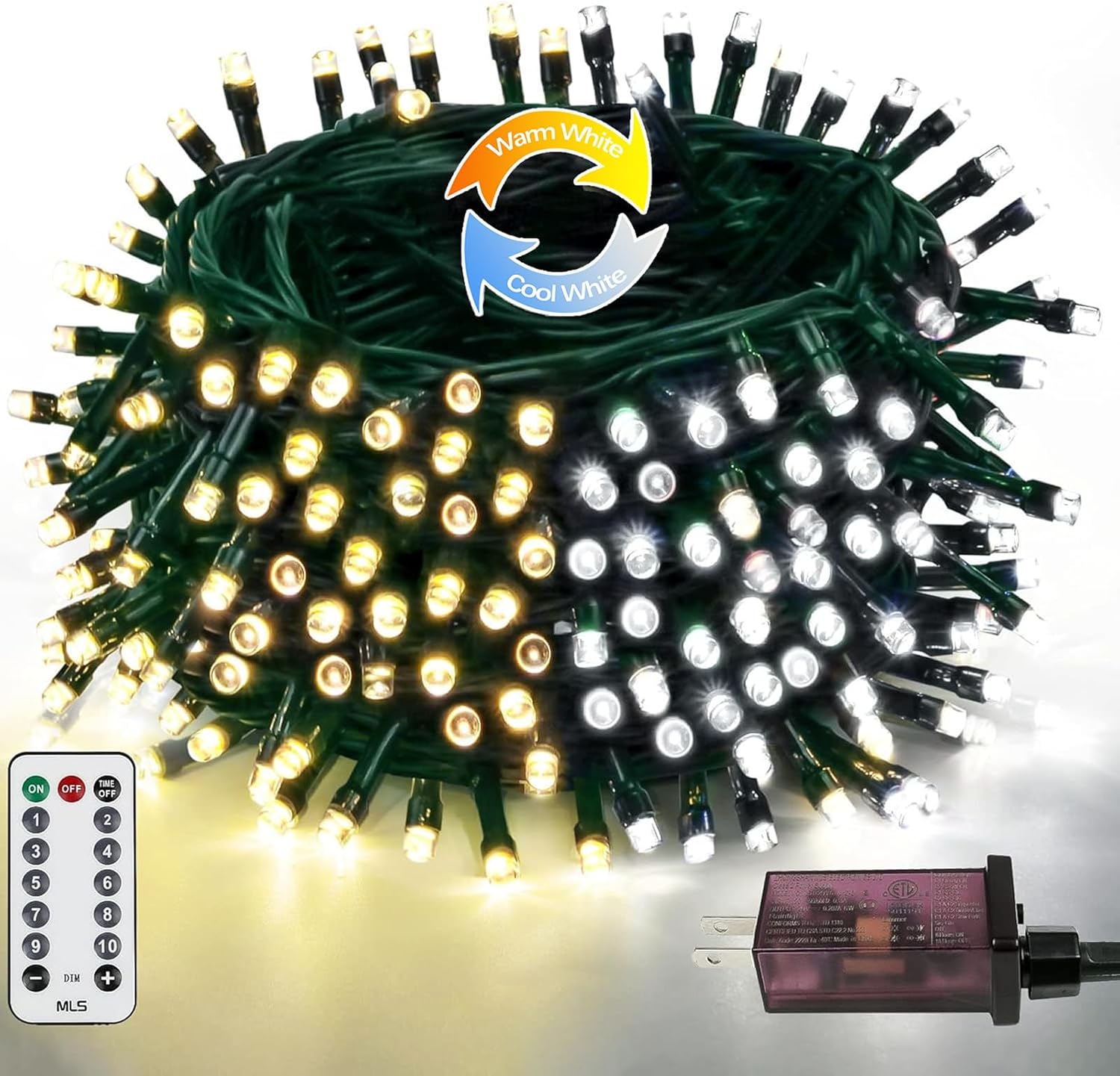 - New Upgraded Extendable Plug in String Lights for Christmas Decor: Warm white and cool white two colors in one set,super bright with new upgraded LED bulbs. This extendable 200 LED green wire plug in string lights have 9 lighting modes to satisfy your diverse decorative effect. Total length is 75.8ft, of which 66ft with lights