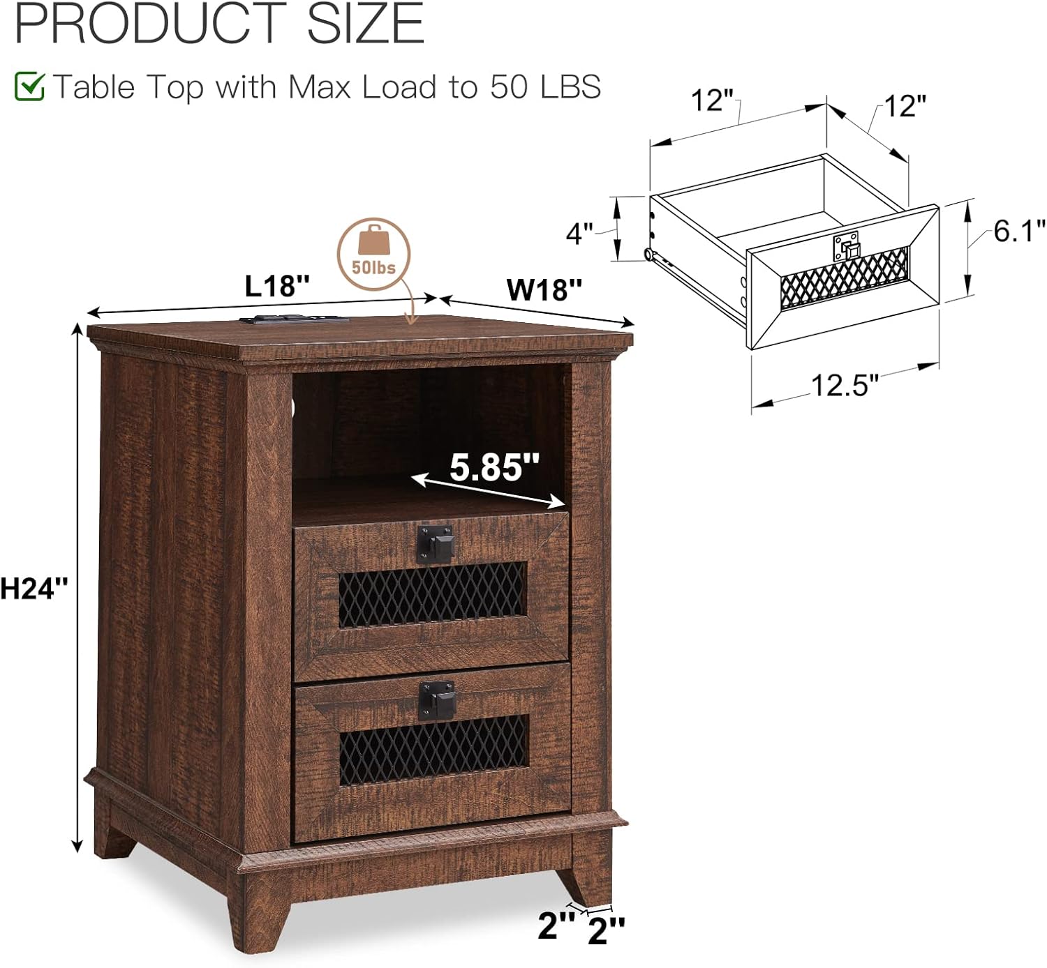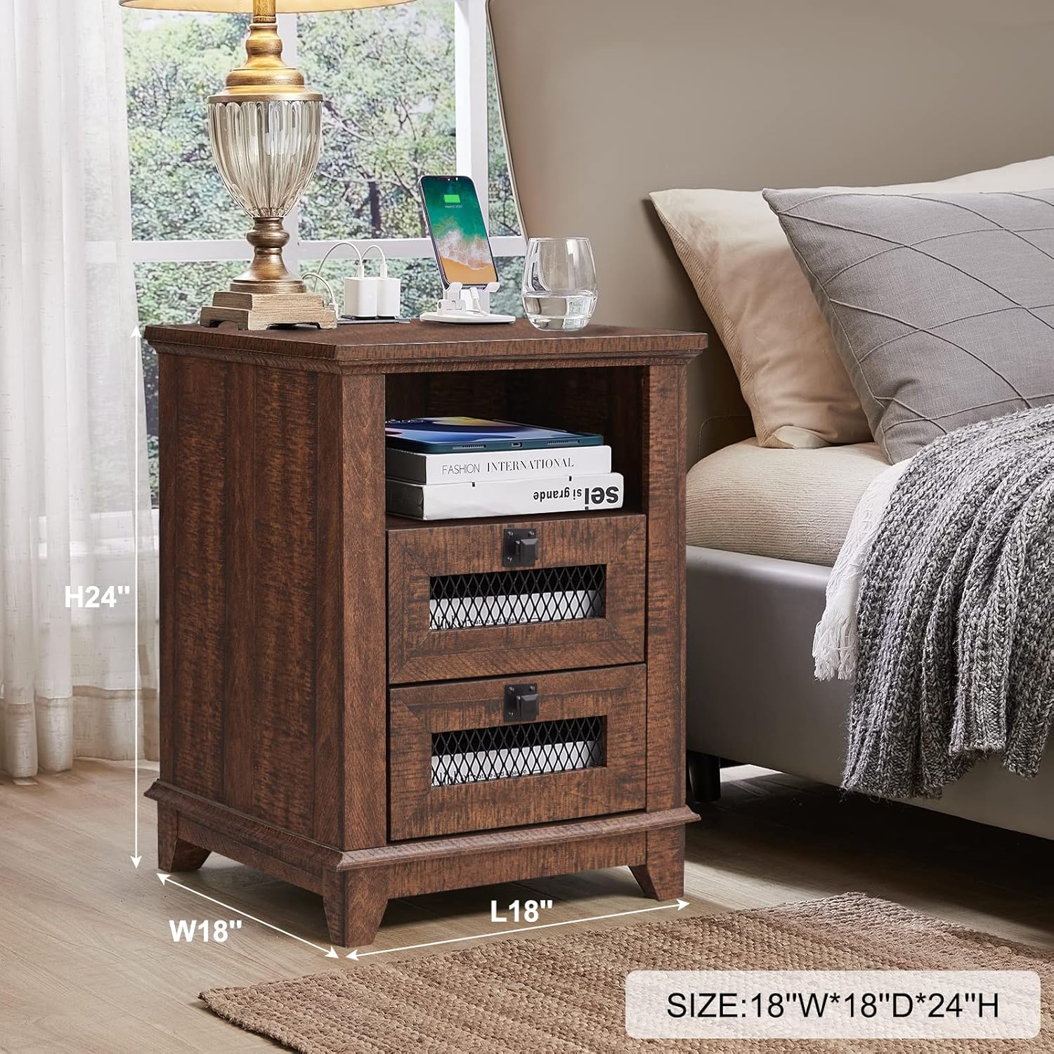 Nightstand with Charging Station,OKD 18'' Industrial & Farmhouse End Table with 2 Drawers &Open Cubby, Rustic Mesh Drawer Sofa Side Table w/Storage for Bedroom, Living Room, Office, Reclaimed Barnwood