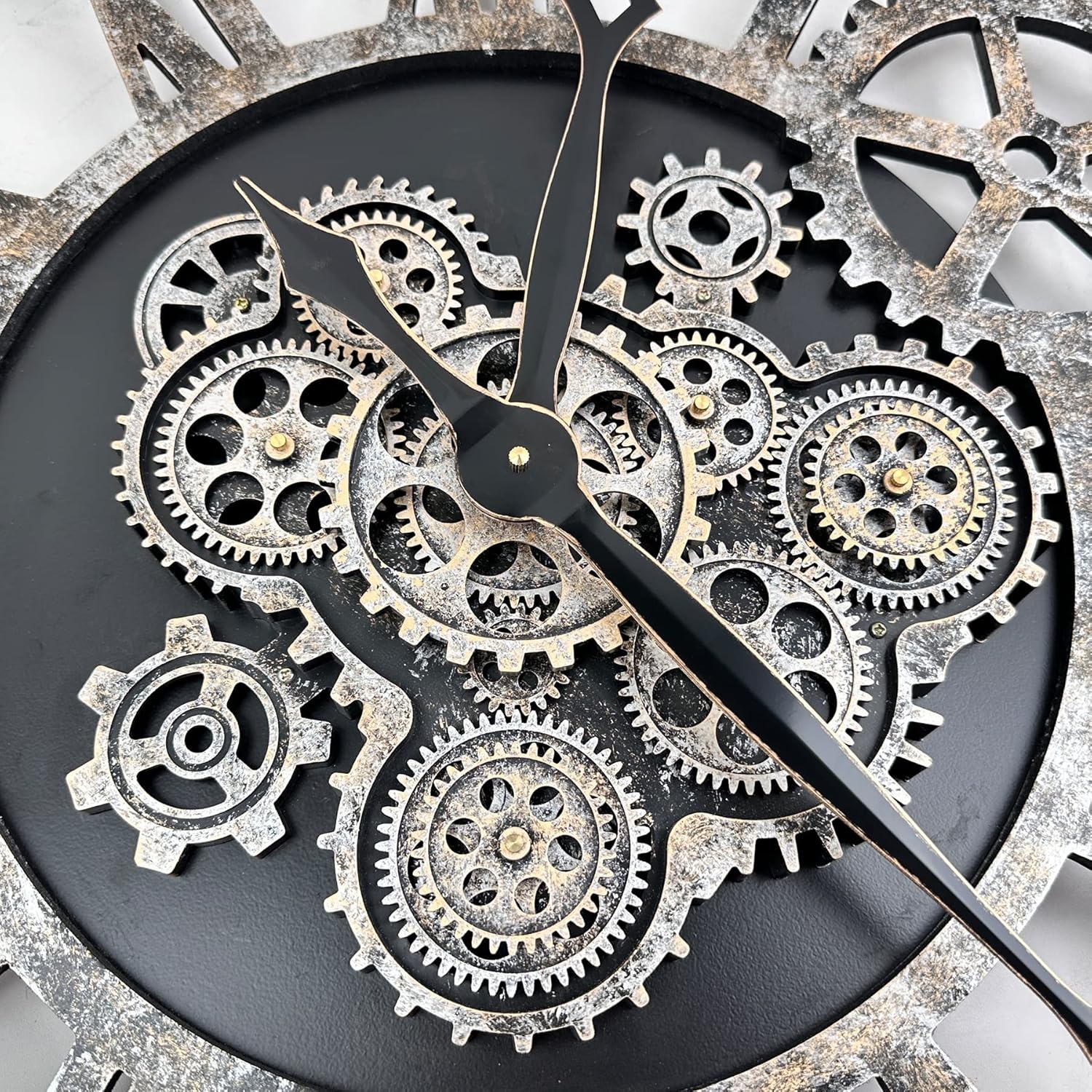 - REAL MOVING GEARS: Large wall clock with unique moving parts is as attractive as it is functional. Put batteries in, various gears start rotating fluently. Moving gear wall clock is amazing looking on the wall and will get so many compliments on it. Made from solid wood and painted by Rust-like color on wall clock create a very rustic and industrial atmosphere. Farmhouse wall clock is professionally handmade and pursuit of naturalness, so it may have some little imperfections.
